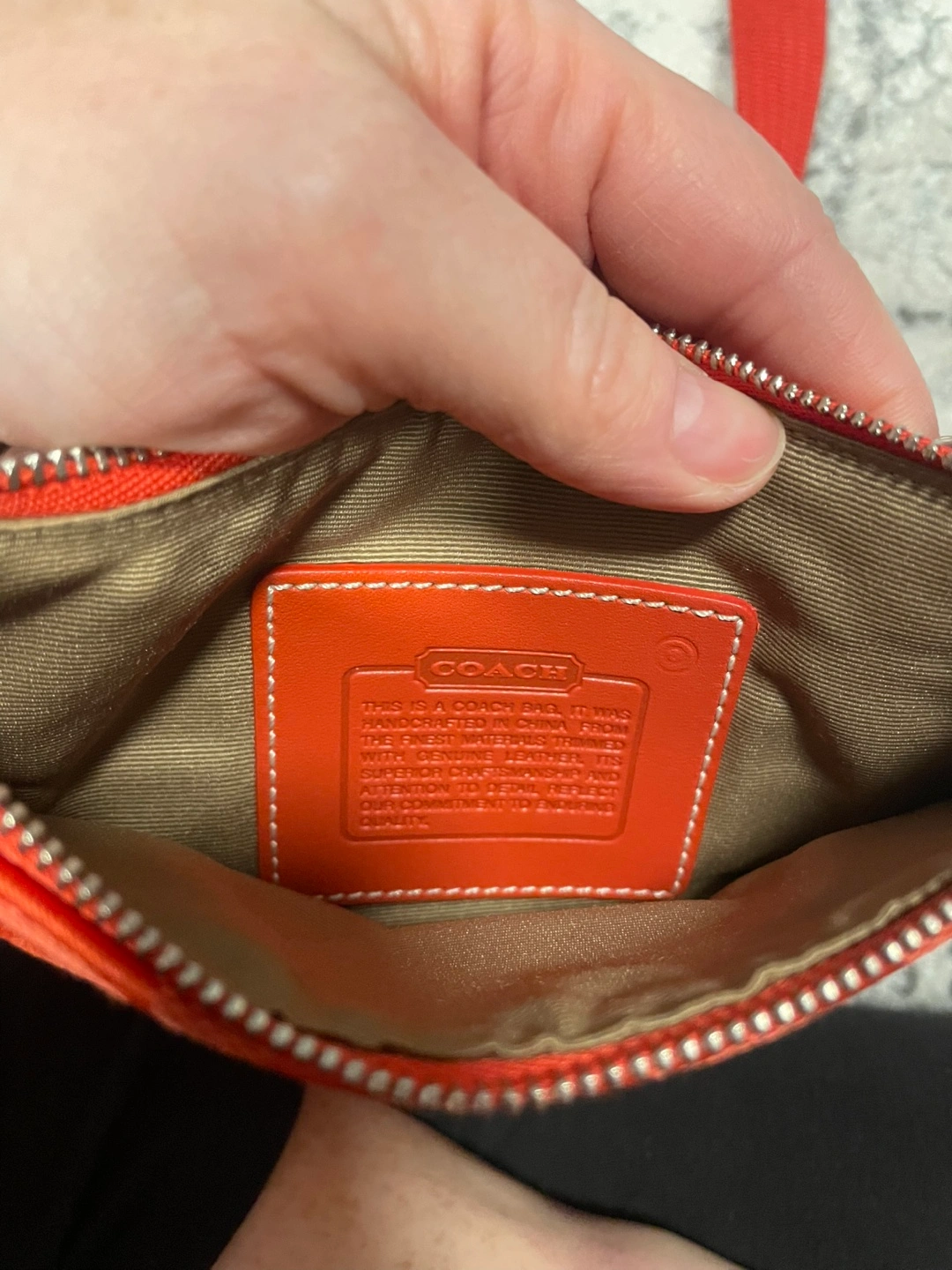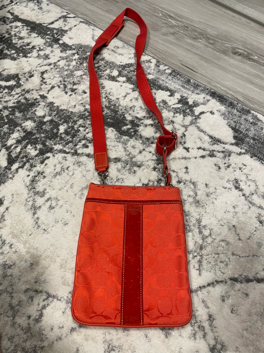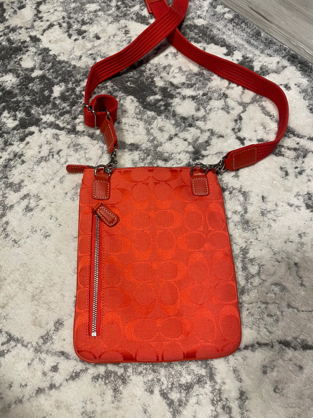 Red Coach crossbody bag. Features a zip closure and adjustable strap. Small and compact.