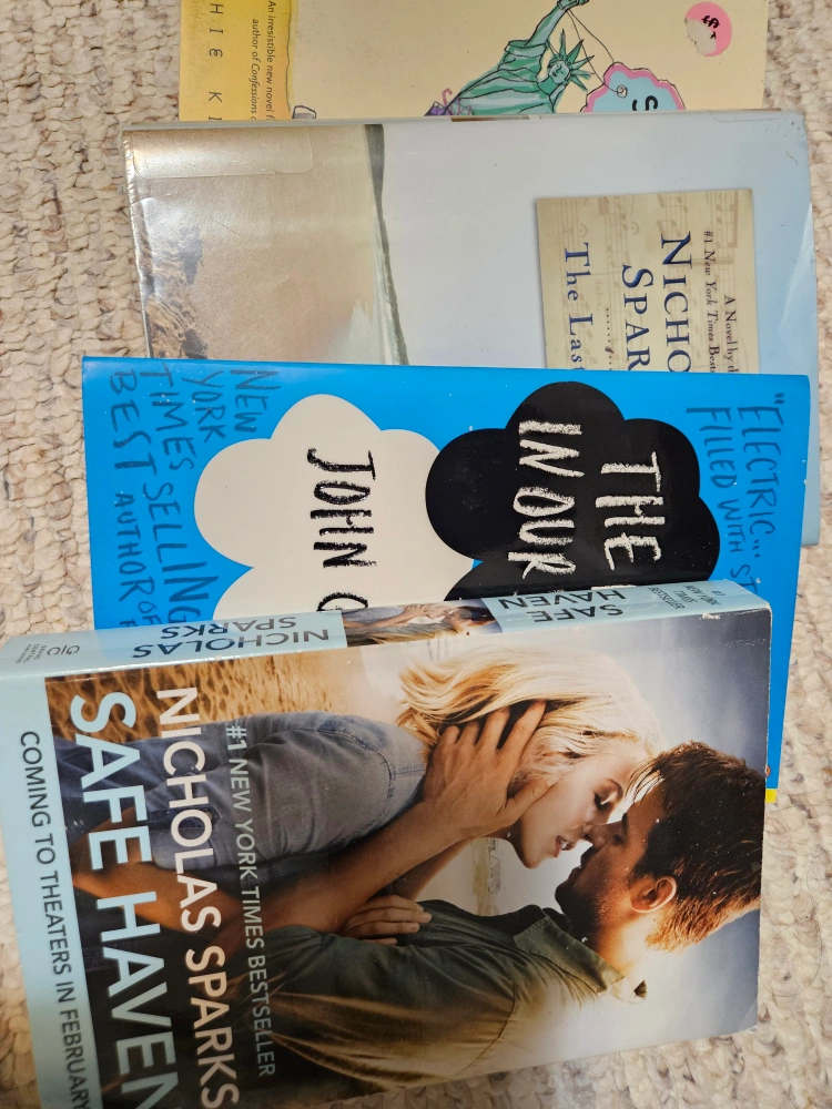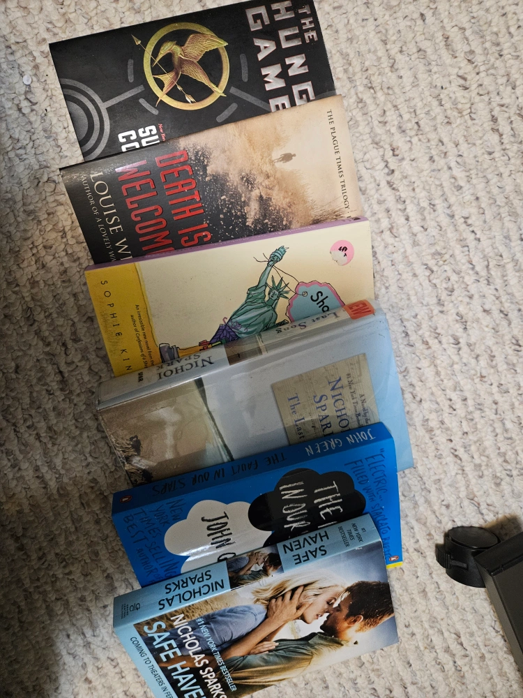 Bundle includes various novels. Titles include *The Hunger Games*, *Death is Welcome*, *The Last Song*, *Safe Haven*, and more. Paperback books, good condition. $5 each