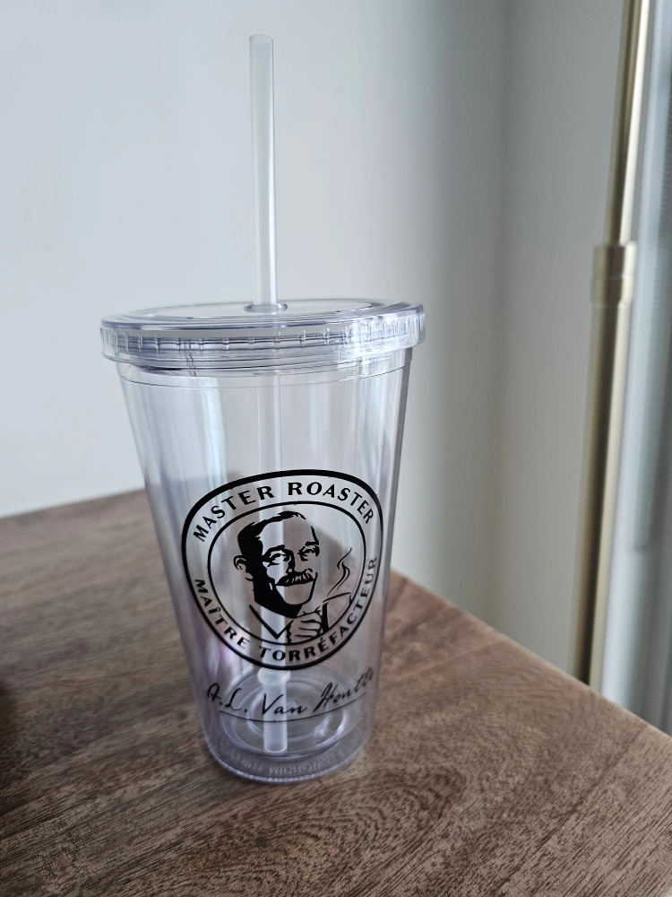 Clear plastic tumbler. Features a black circular logo with the words 'Master Roaster' and 'Maître Torréfacteur' surrounding an illustration of A. L. Van Houtte. Includes a clear plastic straw. Reusable.BrandNew. Never Used