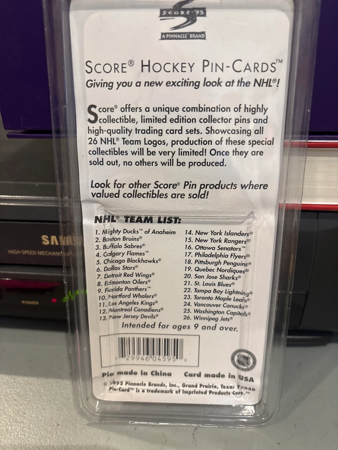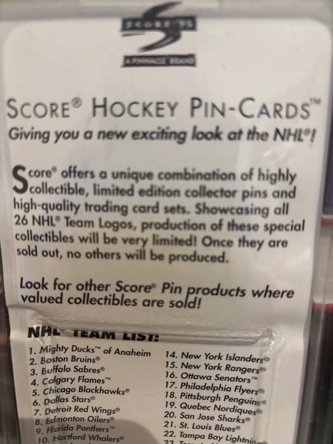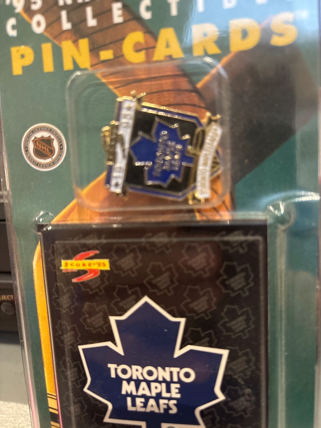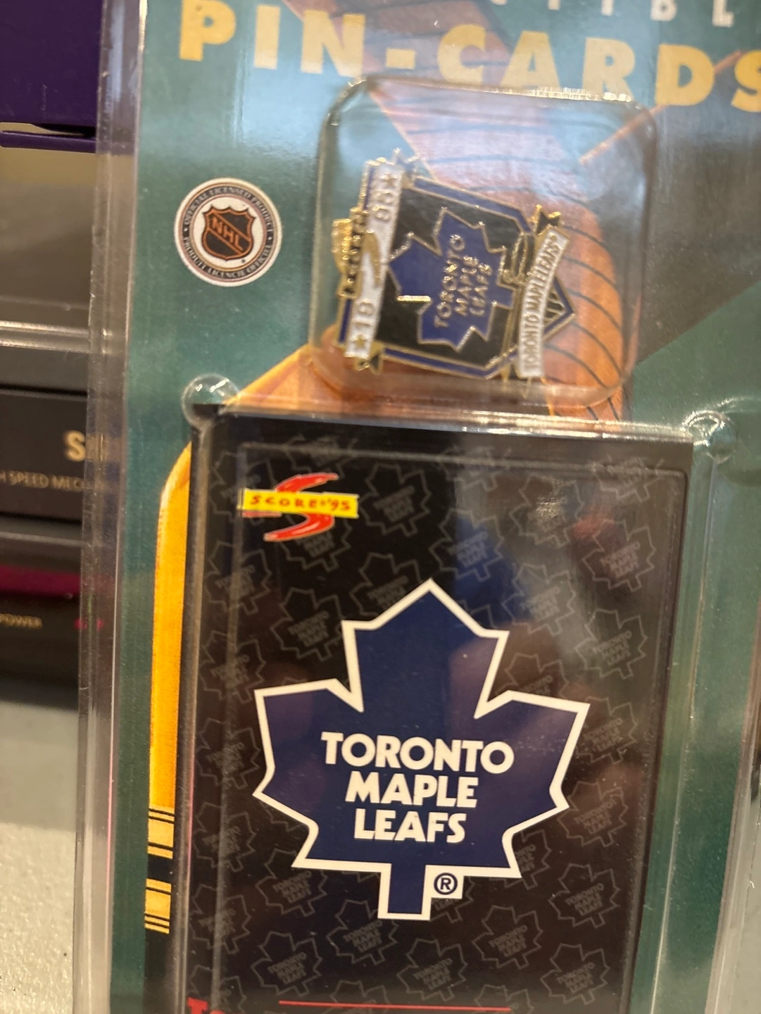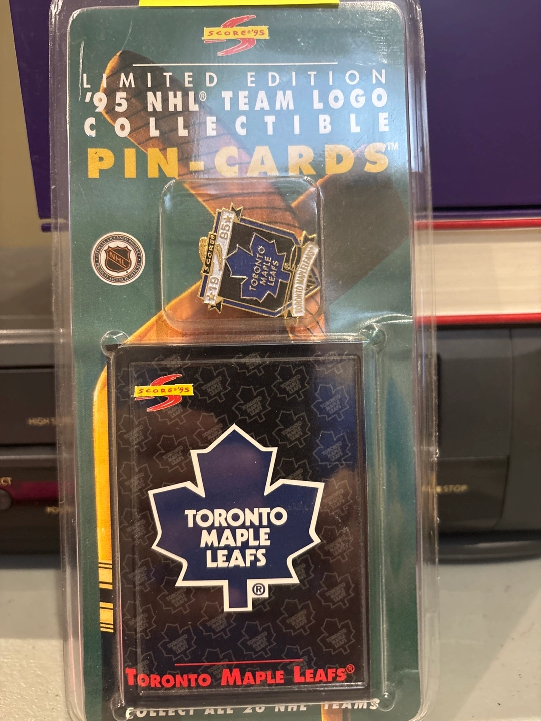Vintage 1995 Score Hockey Pin-Cards collectible. Features Toronto Maple Leafs logo pin and trading card. Limited edition, part of a 26-team set. Excellent condition, still in original packaging.