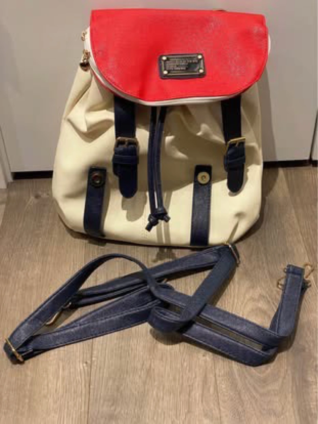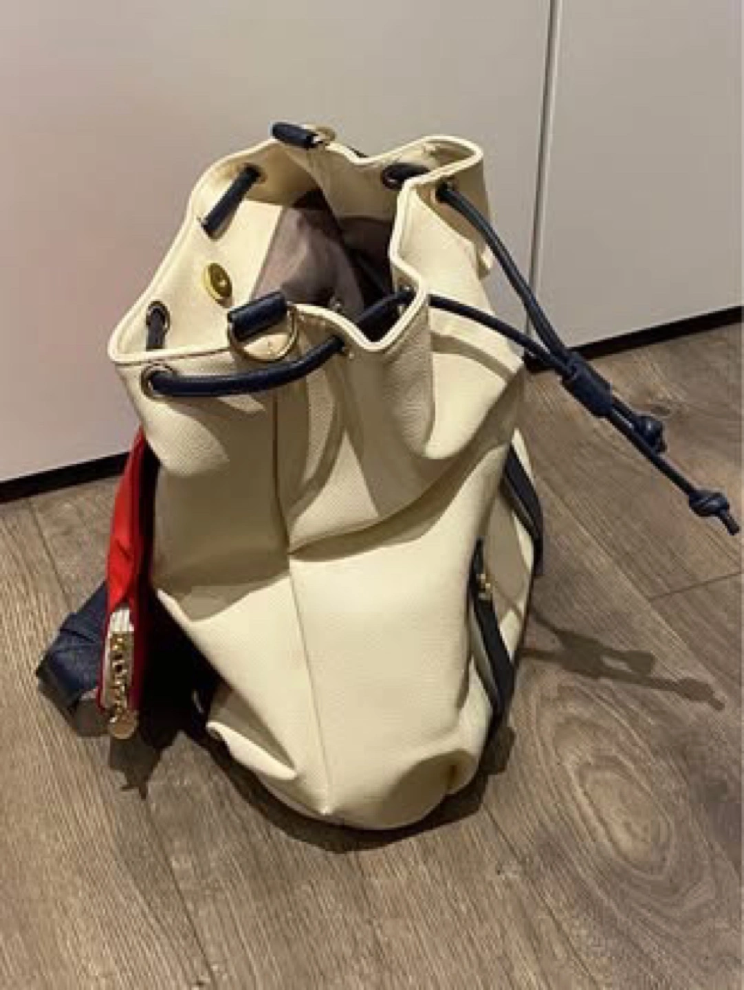 Cream coloured drawstring backpack. Red and navy blue accents. Features multiple compartments and adjustable straps. 13”h 13”w 5”d