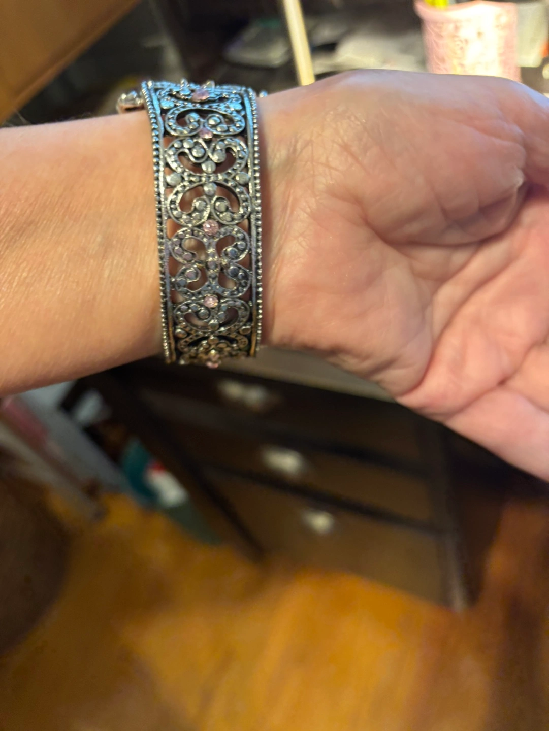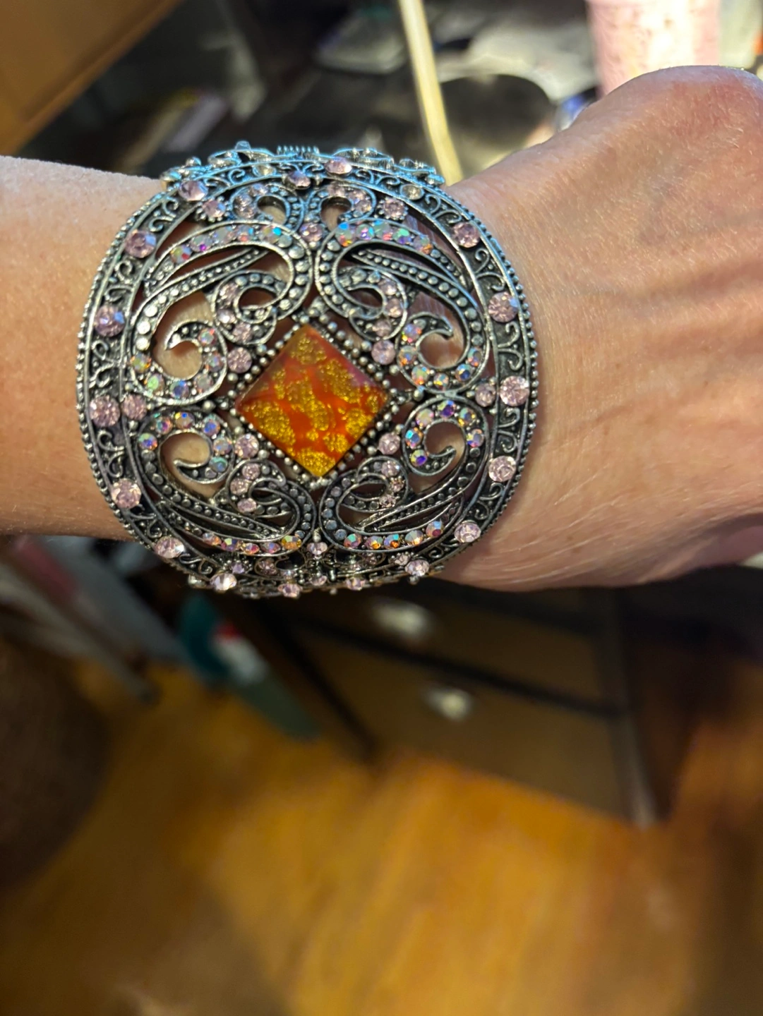 Beautiful silver tone cuff bracelet. Features an ornate design with pink crystals and a central orange stone. Adjustable fit. Great statement piece. Closes on a hinge !!
