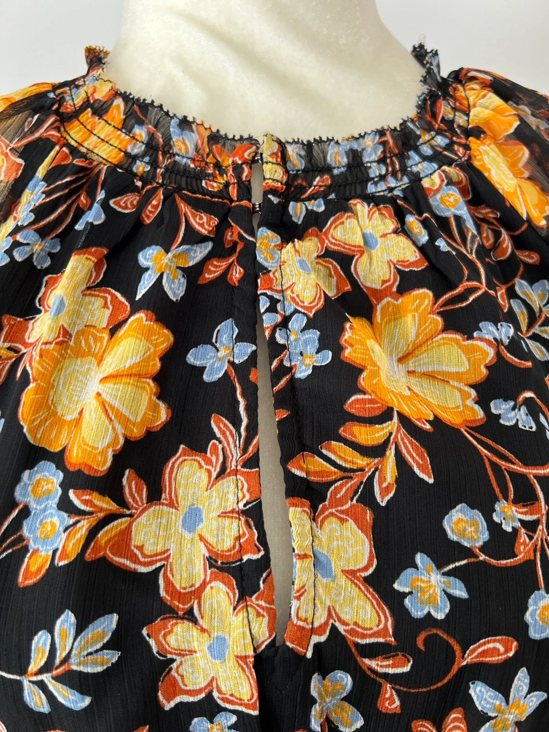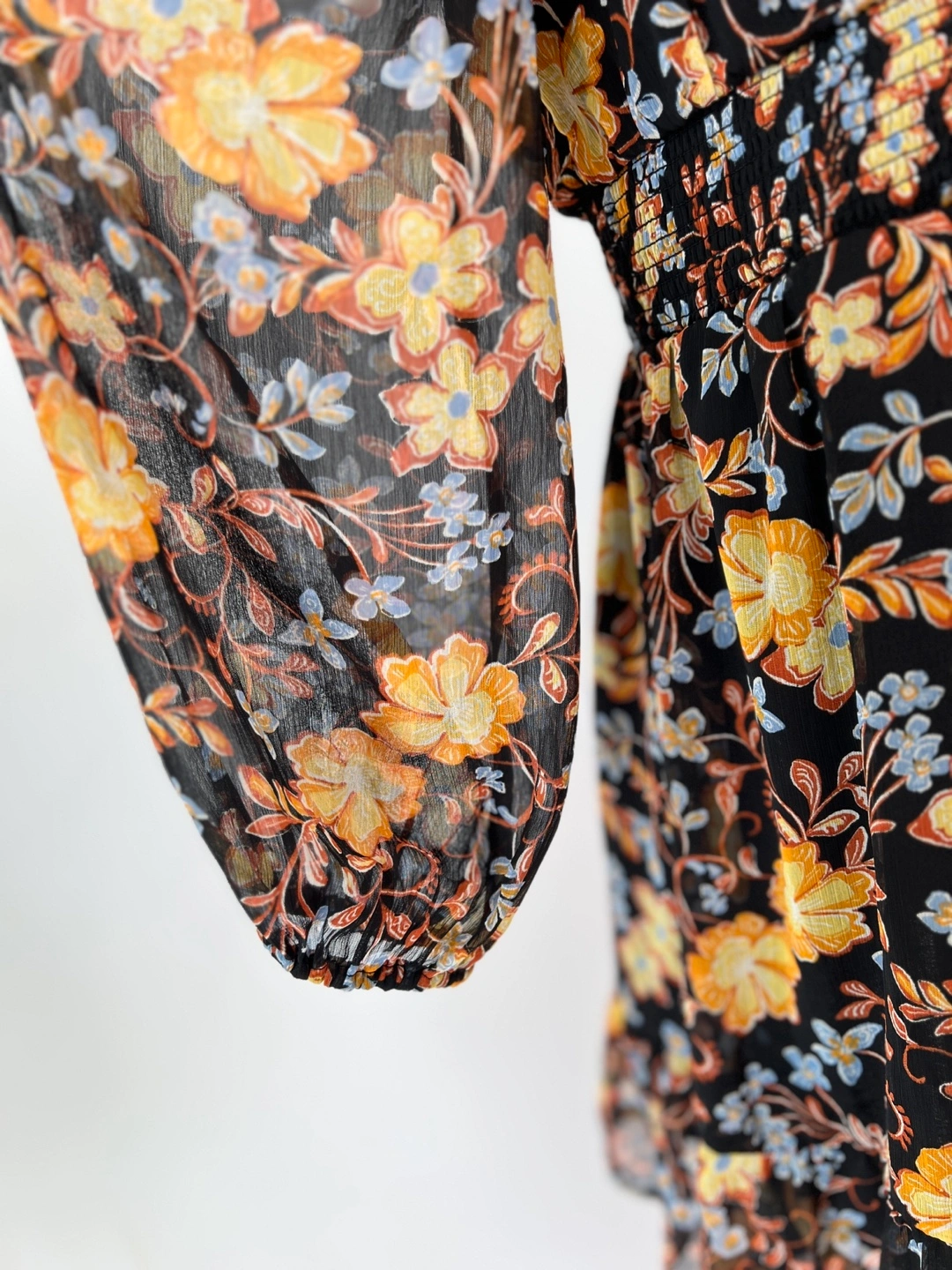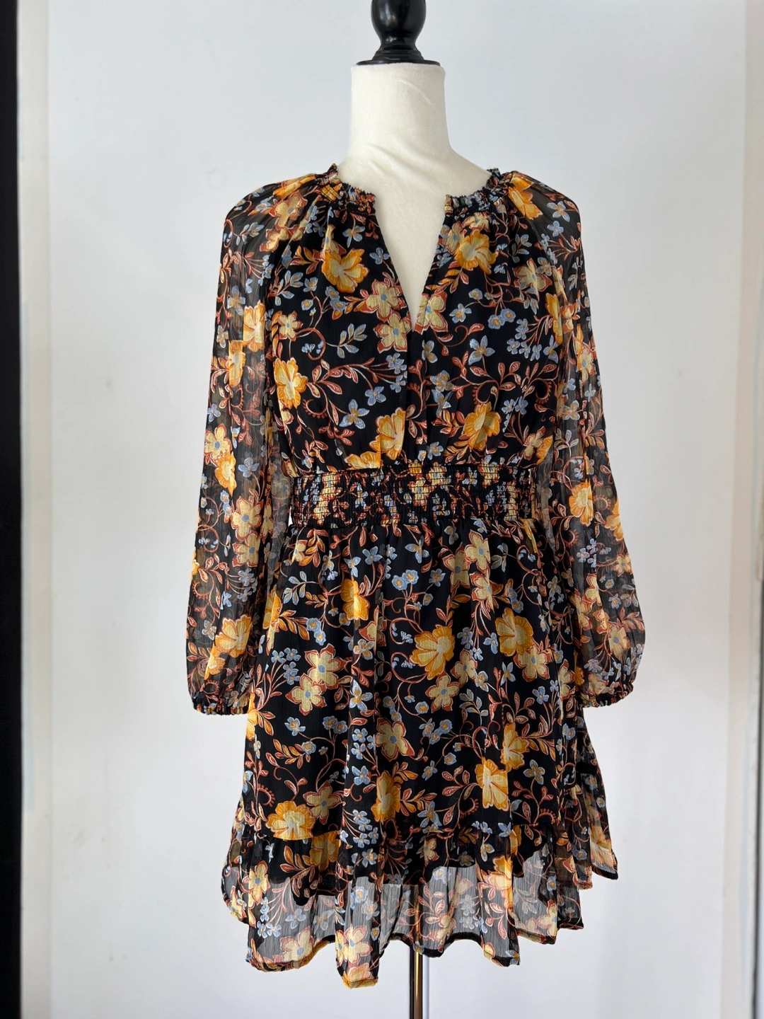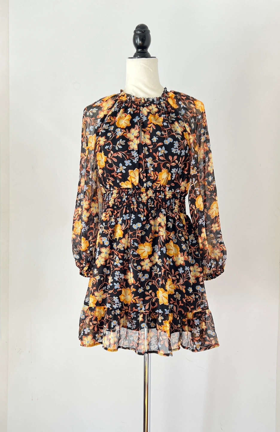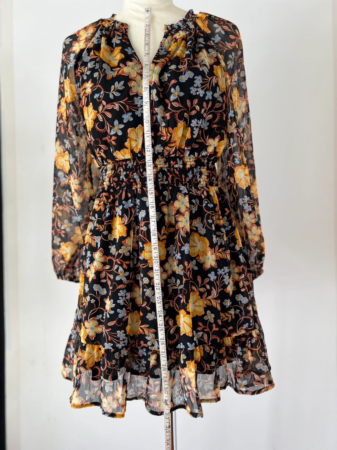 Pretty and light mini dress. Features a lovely floral print in yellow, orange and blue. Long sleeves and smocked waist. Keyhole neckline can be worn open or closed. Perfect condition. Worn once. Machine wash.