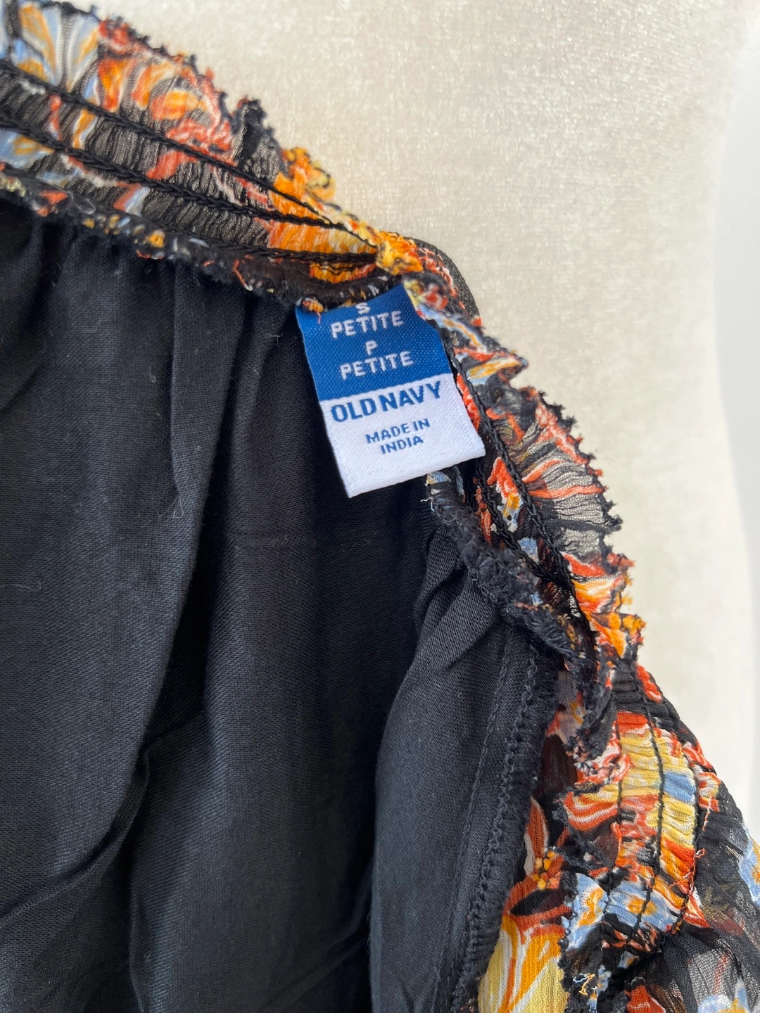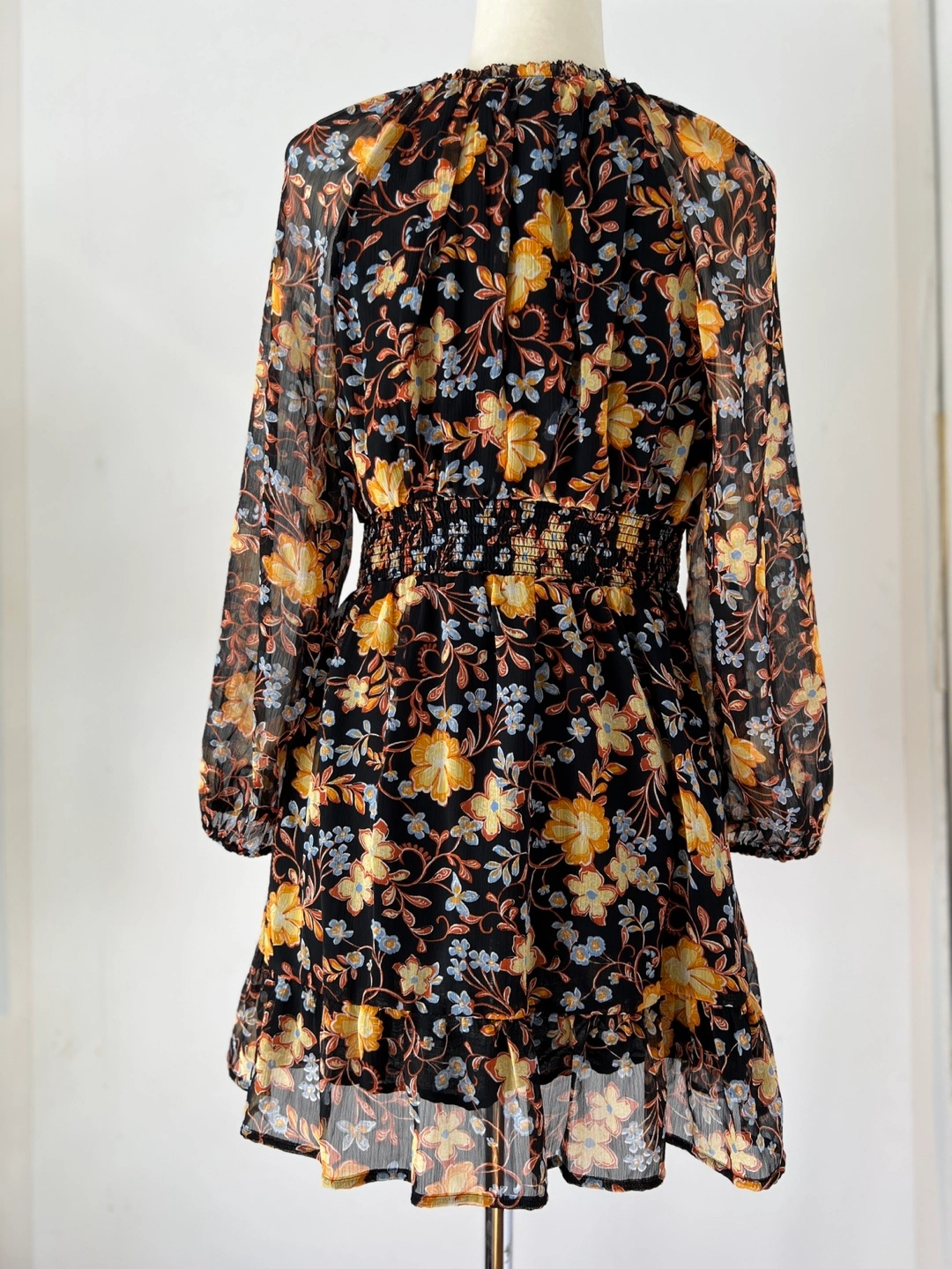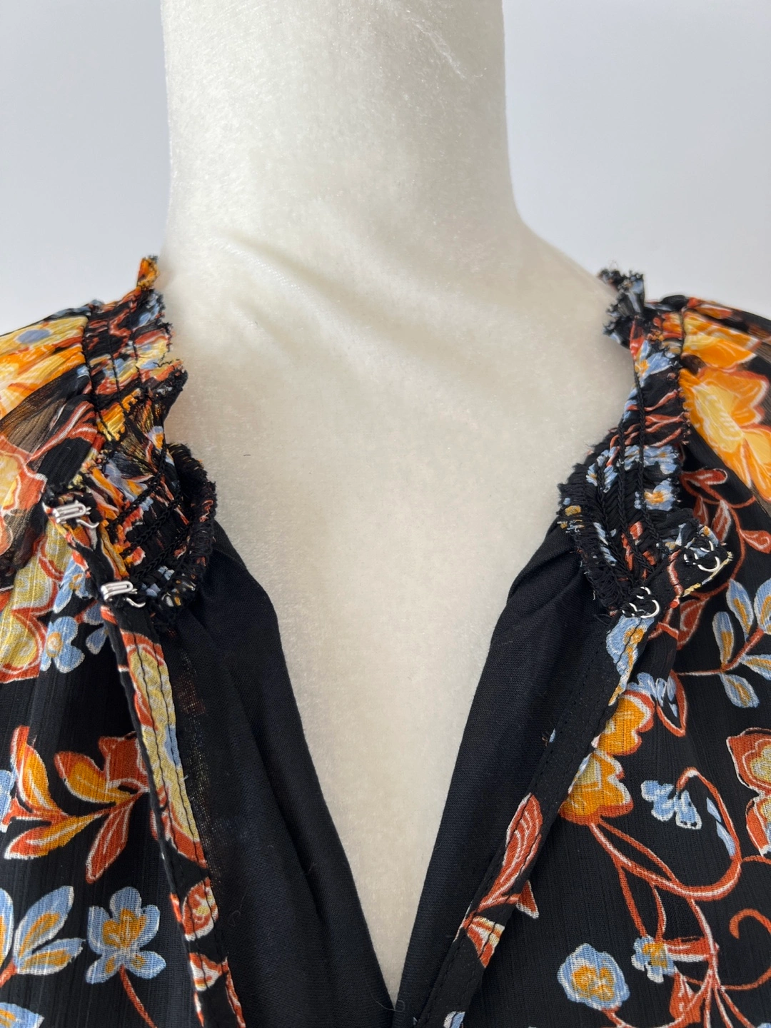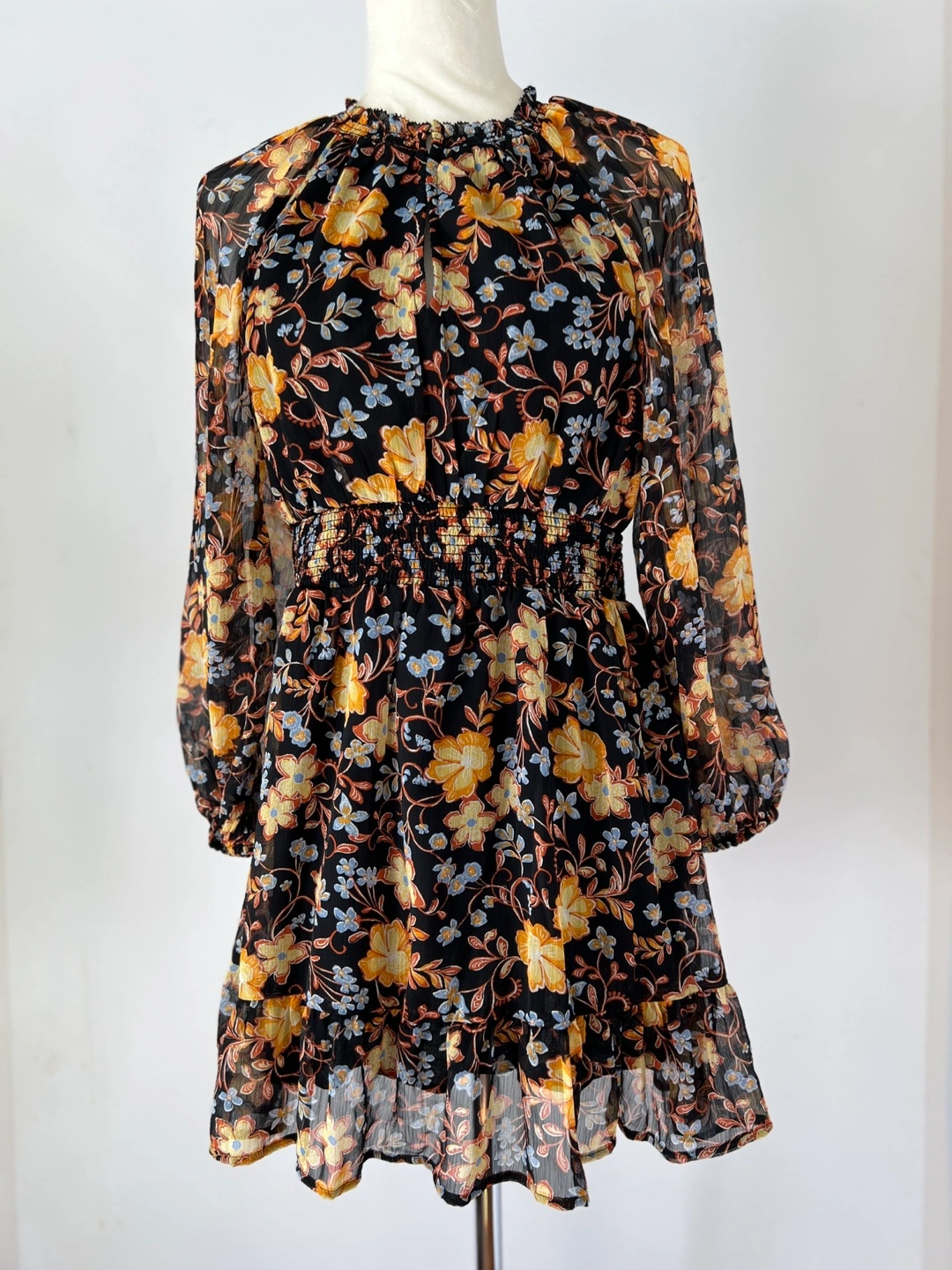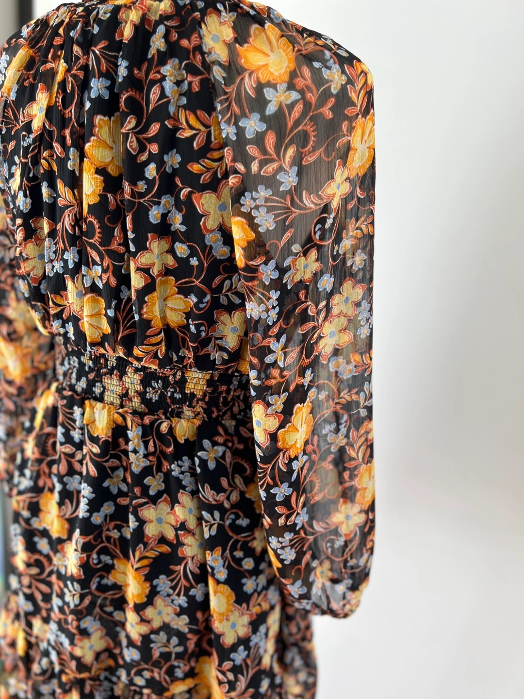 Pretty and light mini dress. Features a lovely floral print in yellow, orange and blue. Long sleeves and smocked waist. Keyhole neckline can be worn open or closed. Perfect condition. Worn once. Machine wash.