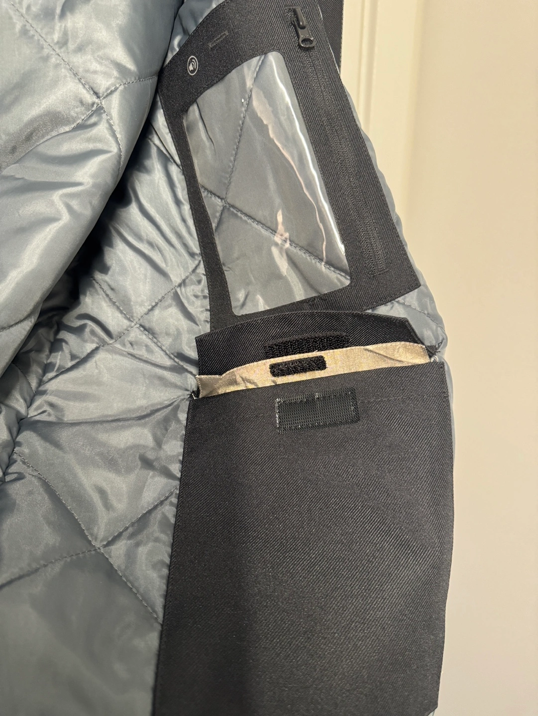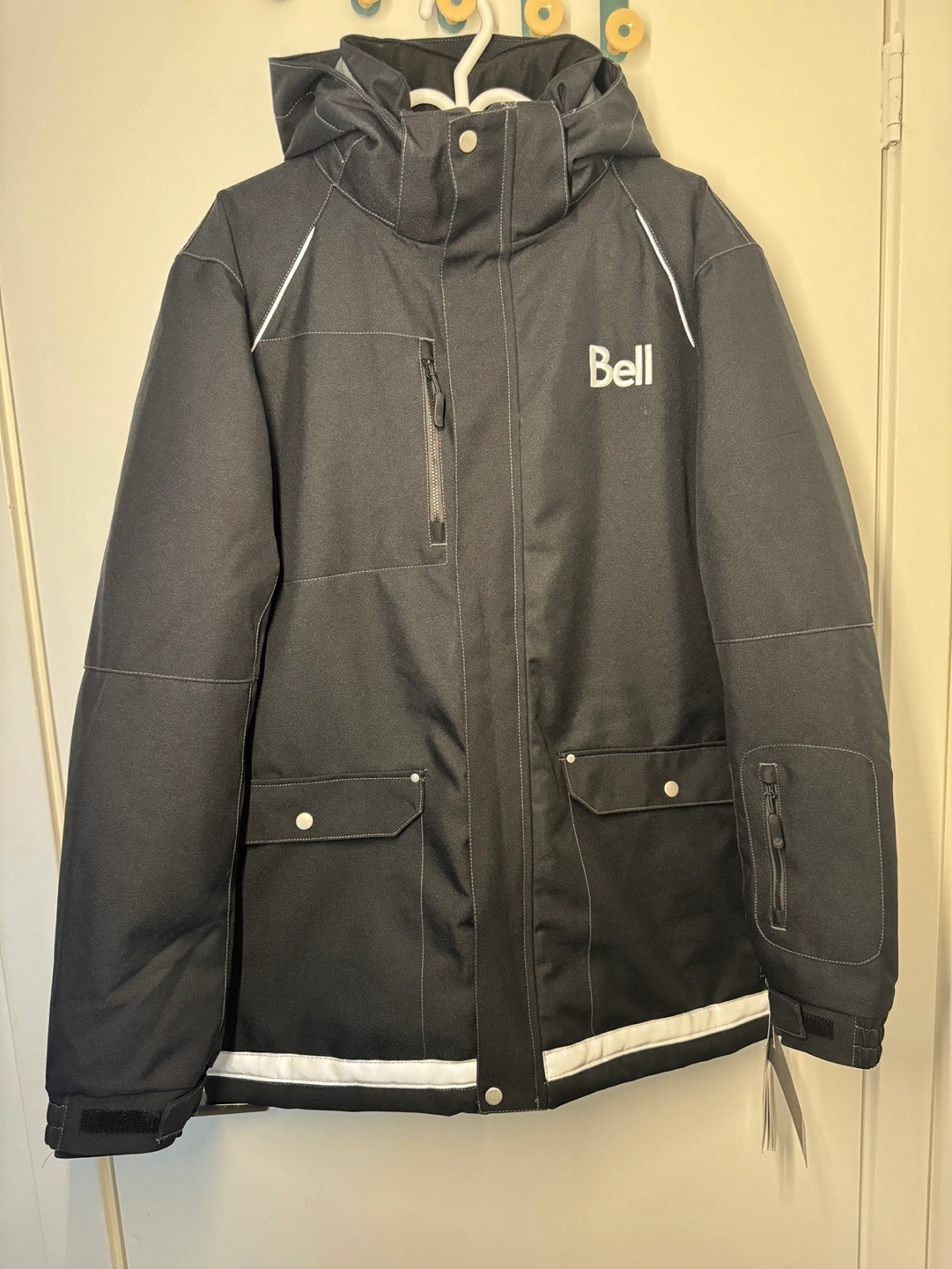 Black winter jacket. Multiple pockets. Reflective strip. Hooded. Size Large. Brand New condition.