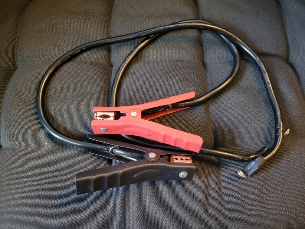 jumper, welding, jump start, grounding cables, replacement clamps. Two clamps, one red and one black. Approximately 80cm long, thick wires. Heavy-duty alligator clips with copper insertsand strong springs. . barely used. great for project