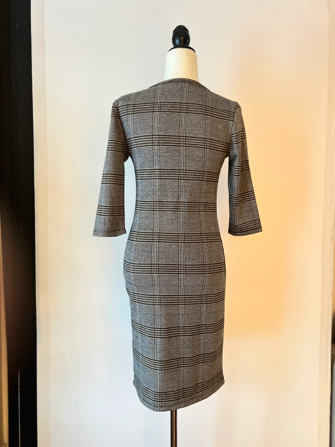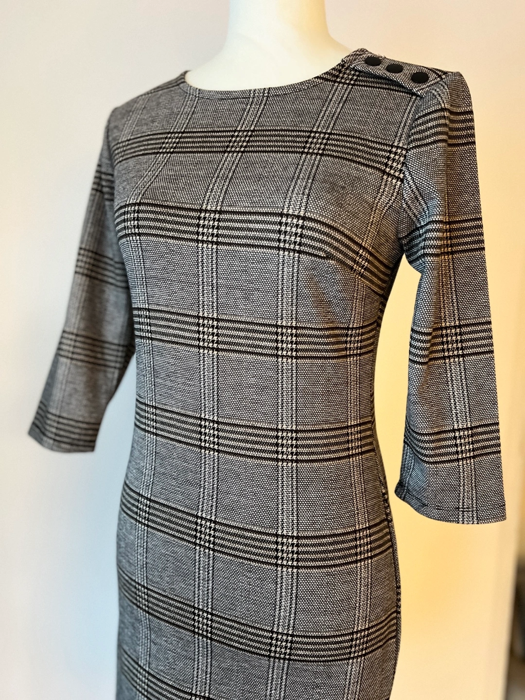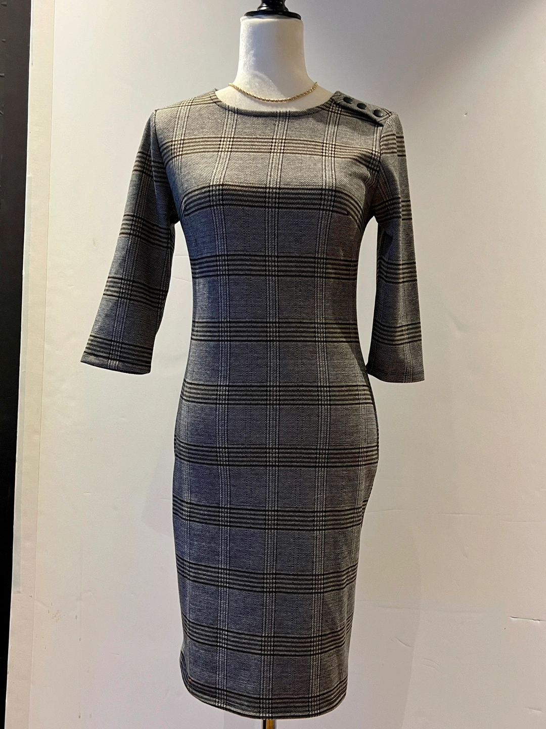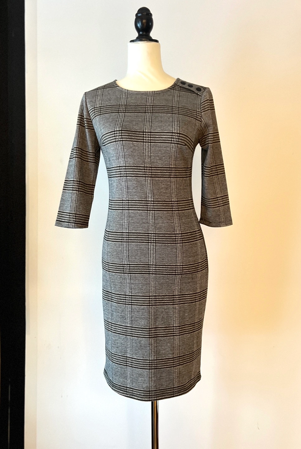 Grey and black plaid pencil dress. Three-quarter sleeves. Button detail on shoulder. Form-fitting silhouette. Excellent for work or a night out.