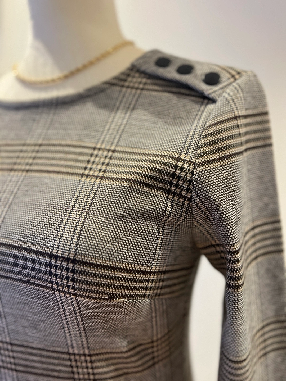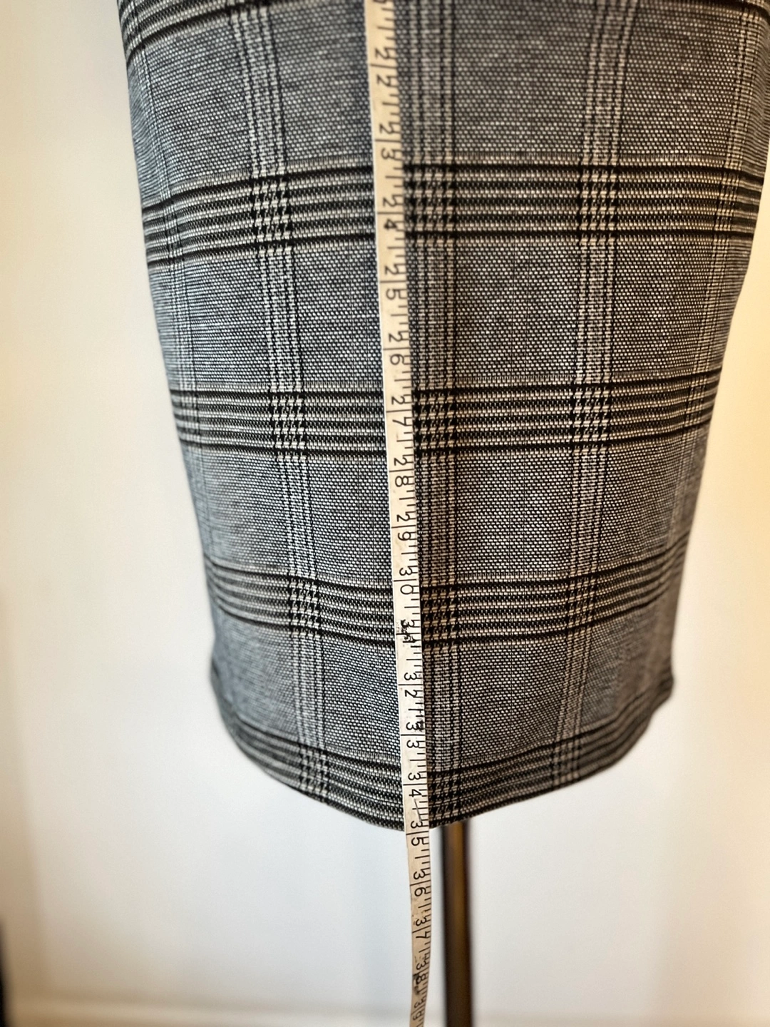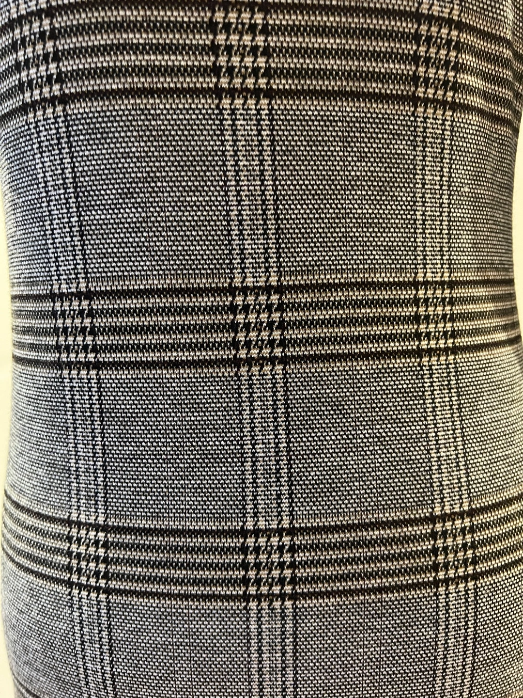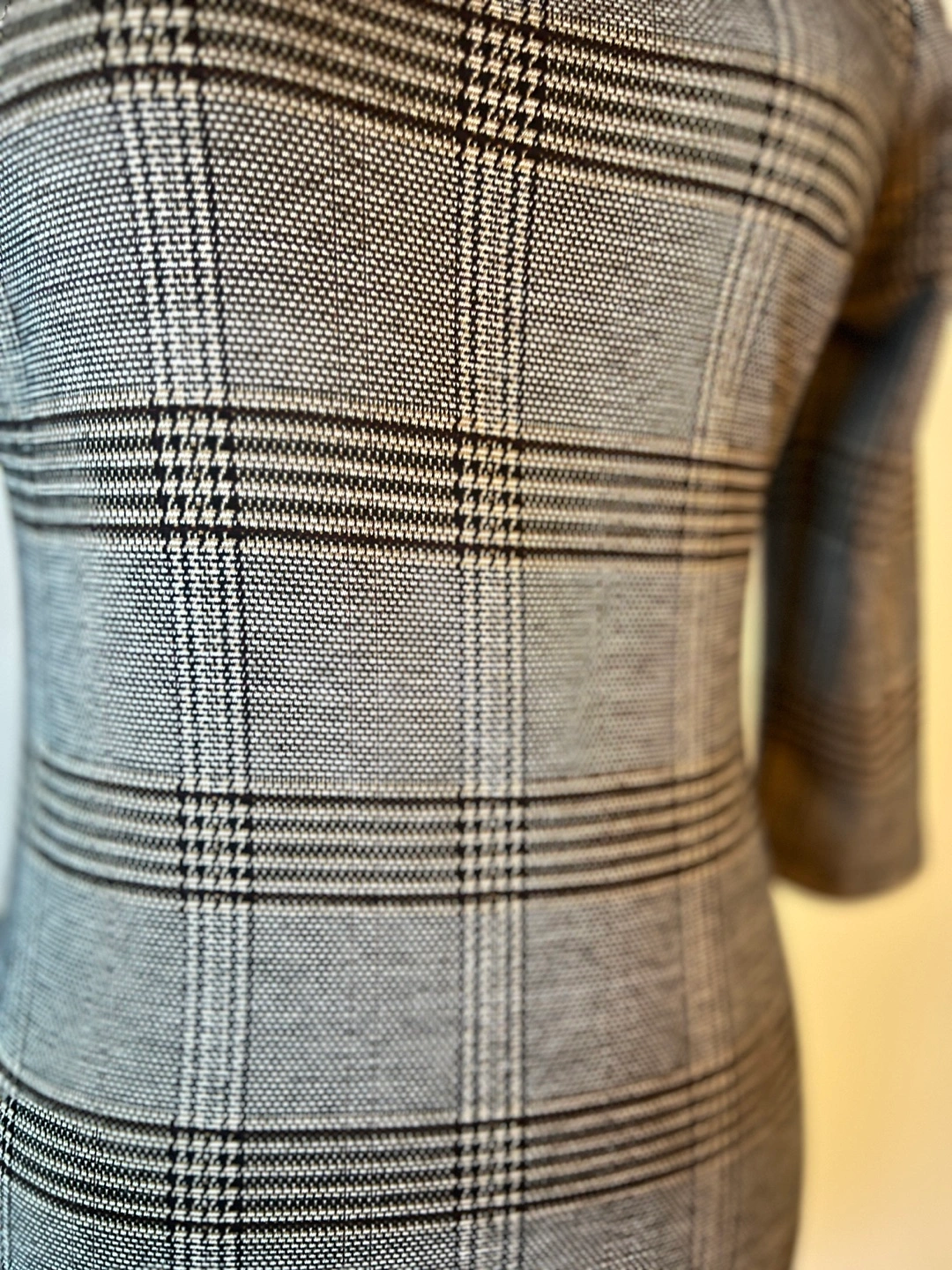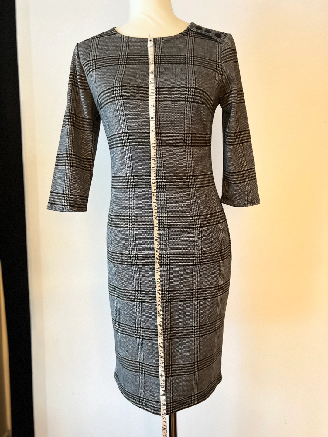 Grey and black plaid pencil dress. Three-quarter sleeves. Button detail on shoulder. Form-fitting silhouette. Excellent for work or a night out.