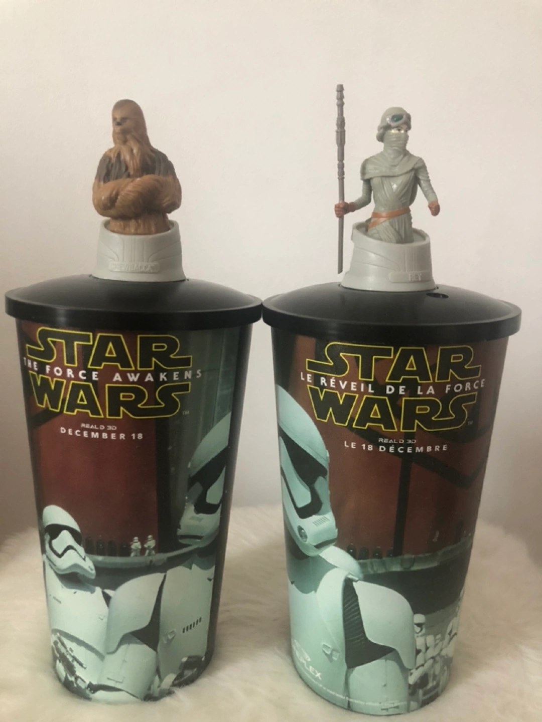 ✨Star Wars Cineplex Collection Cups. ✨Rey figurine and Chewbacca figurine. ✨Can sell individually for half the price. ✨Both used once, the night of the film, washed with soap and stored in a glass cupboards. ✨Toronto Pickup. ✨Cash Only.