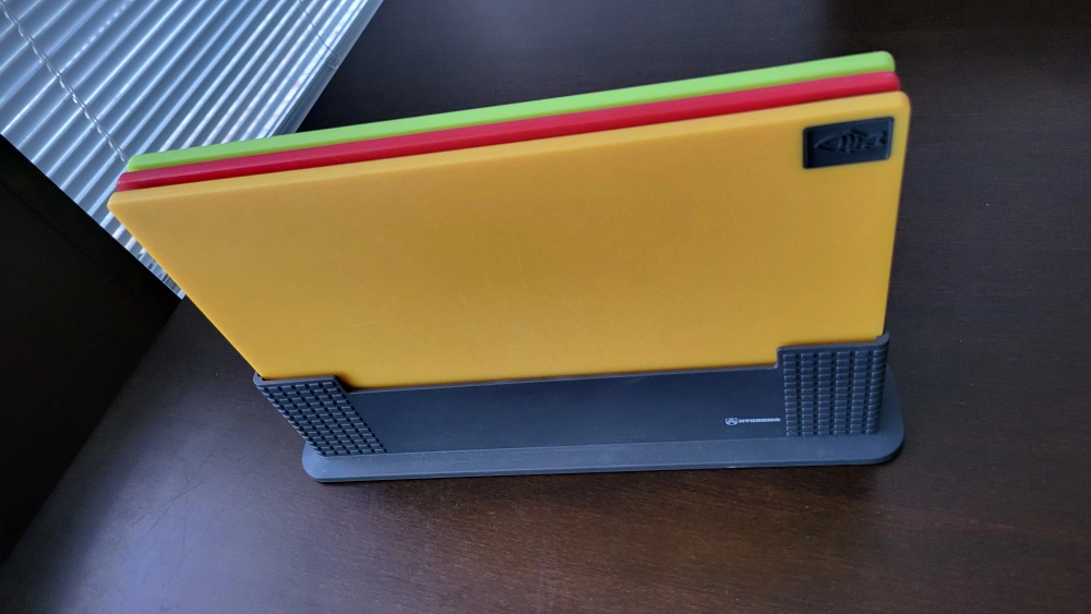 Colourful cutting boards, yellow, red, and green. Non-slip base. Great for kitchen organization. Includes a convenient stand.