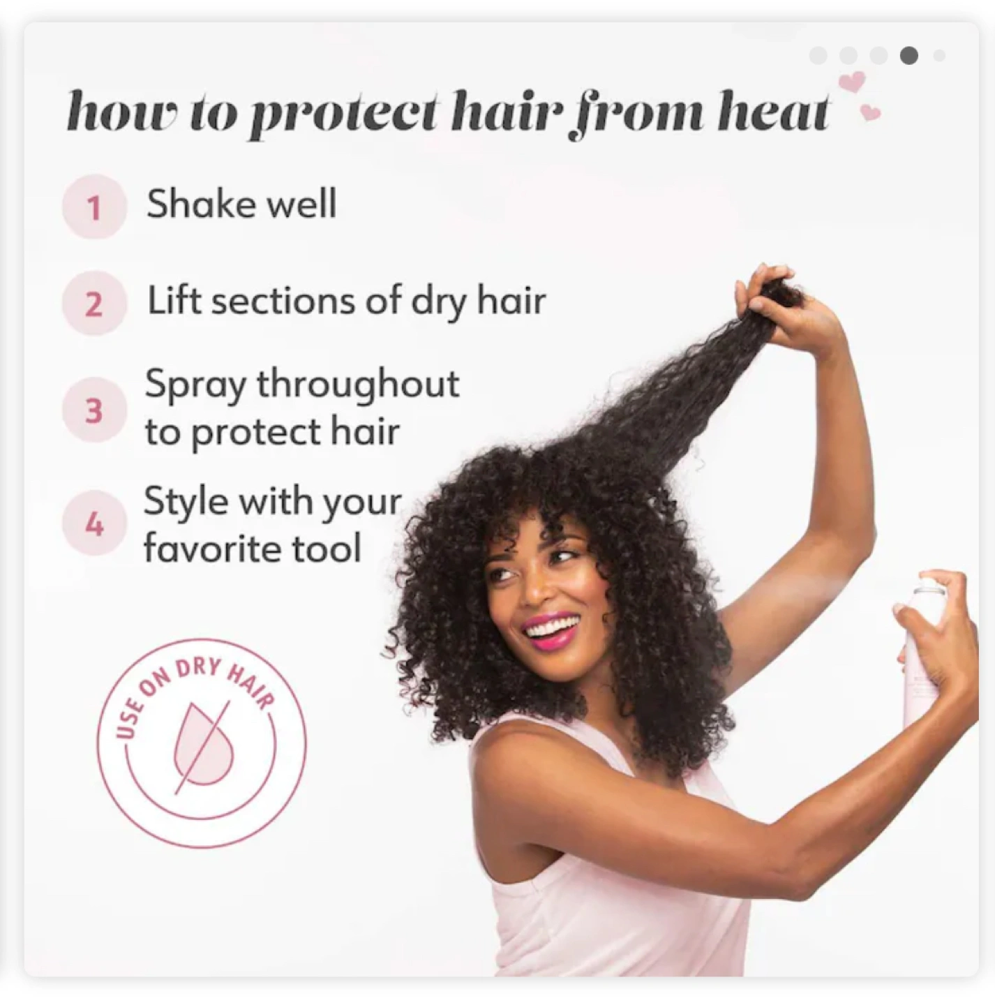 Brand new heat protectant mist to protect dry hair from heat styling with curling, straightening, and styling irons! - Perfect for all hair types! From straight to curly to tightly coiled hair! - Provides heat protection up to 450°F - Features a lightweight spray that dries once on hair - Helps control frizz and adds shine