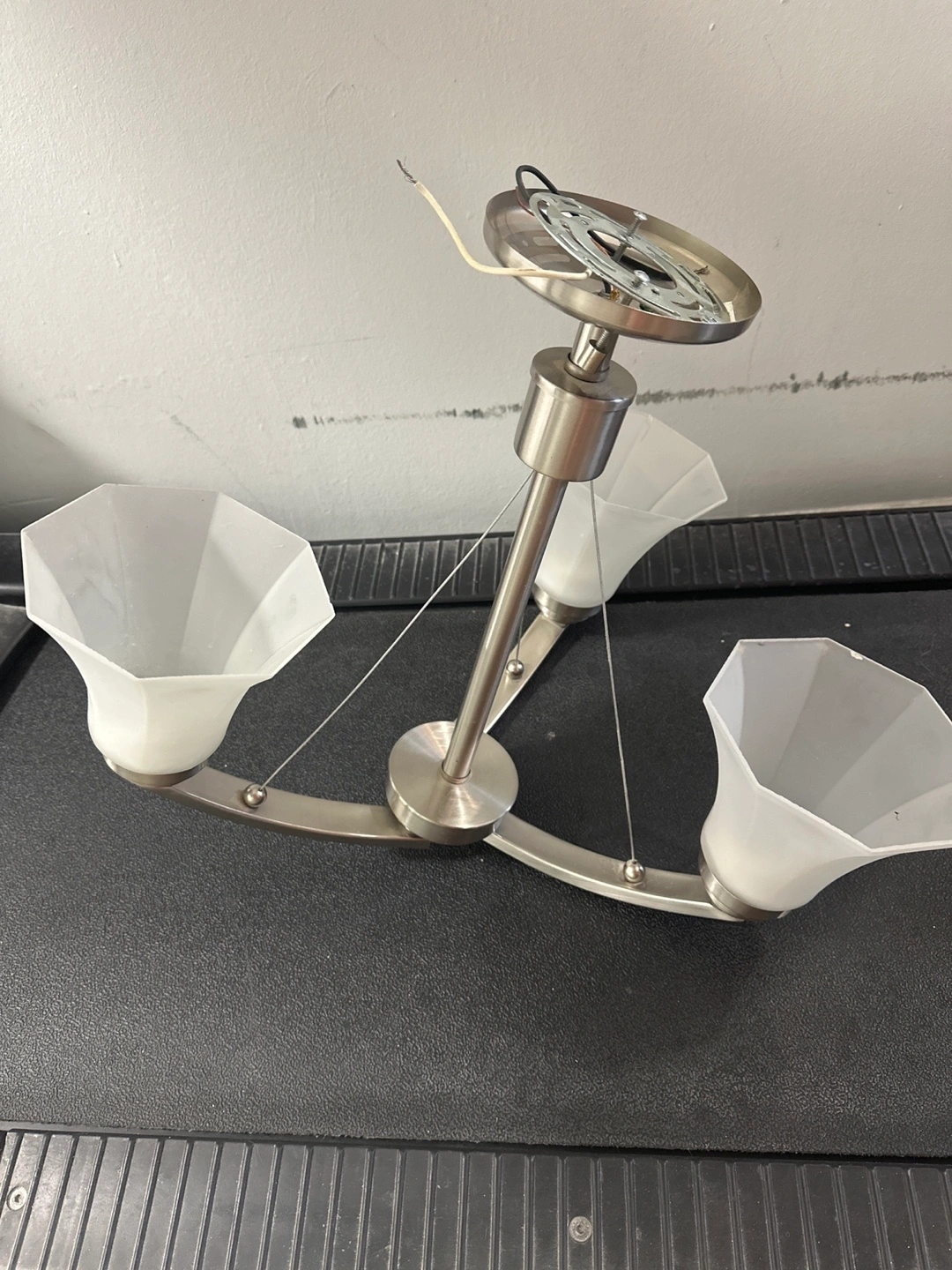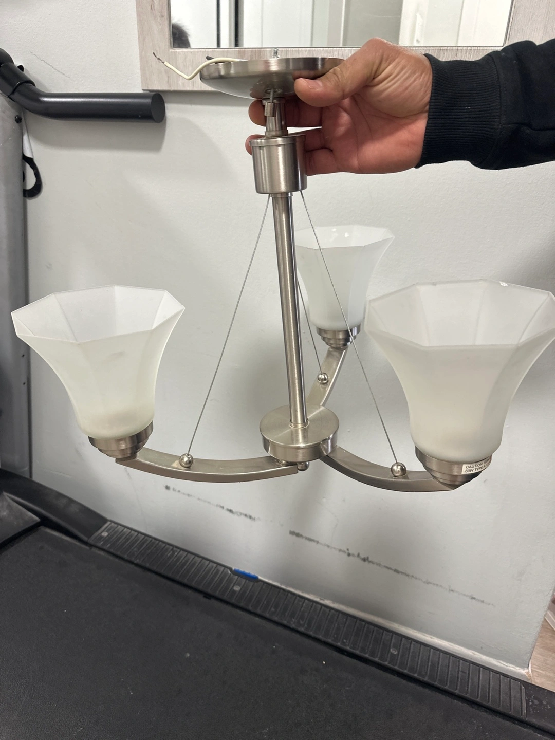 Modern brushed nickel finish. Three frosted glass shades. Includes all mounting hardware. Great for hallways or smaller rooms. Pre-owned, good condition.