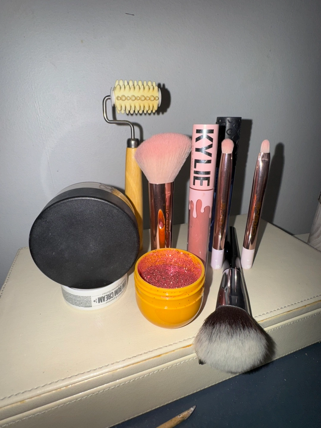 Selling a bundle of makeup items. Includes: ❤️three small rose gold makeup brushes(NEW) ❤️one larger black makeup brush (BRAND NEW) ❌Kylie lip gloss SOLD ❌Big Bang mascara SOLD ❤️Small container of pink glitter (like new) ❤️Face Roller (like new) All gently used or brand new