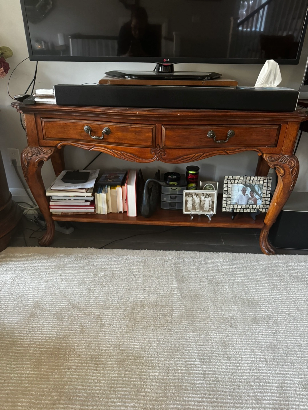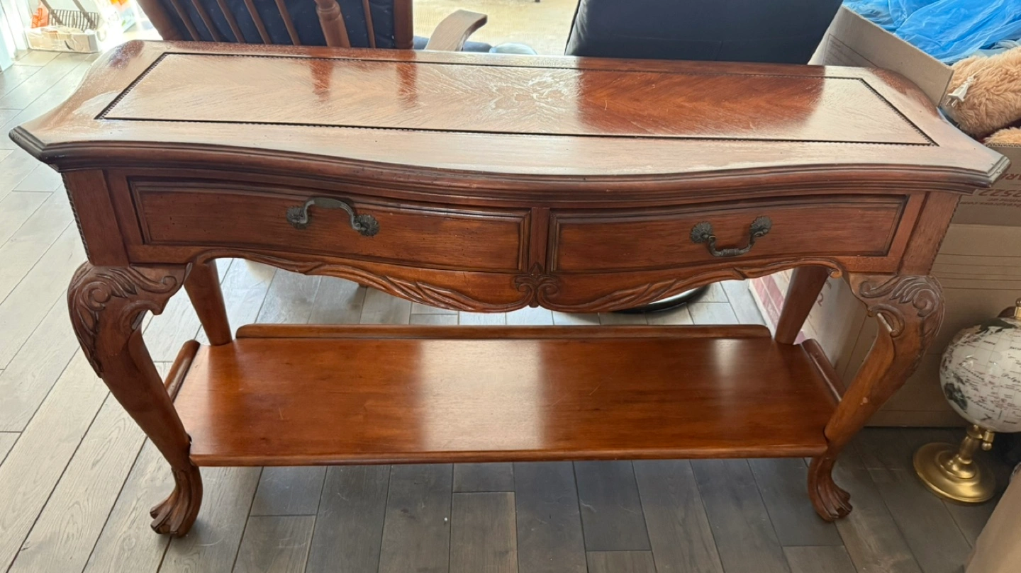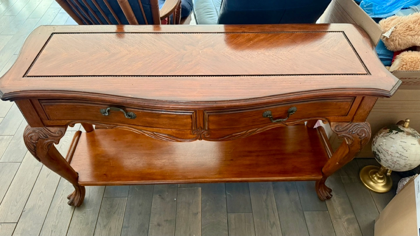 Solid wood console table. Can be used as TV stand (like how I am using it now). Better than IKEA. It has 2 drawers and an underneath shelf. Length - 53 inches Available for pick up at Jane and Dundas street west area. If the ad is up, it is still for sale.