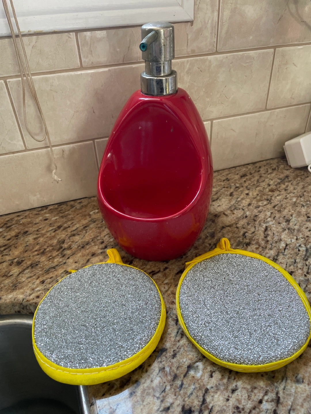 Red ceramic dish soap dispenser. Features a pump top. Includes 3 brand new dish scrubbers with yellow fabric edging. Silver scrubbing surface. Pre-owned, good condition plus the paper towel holder