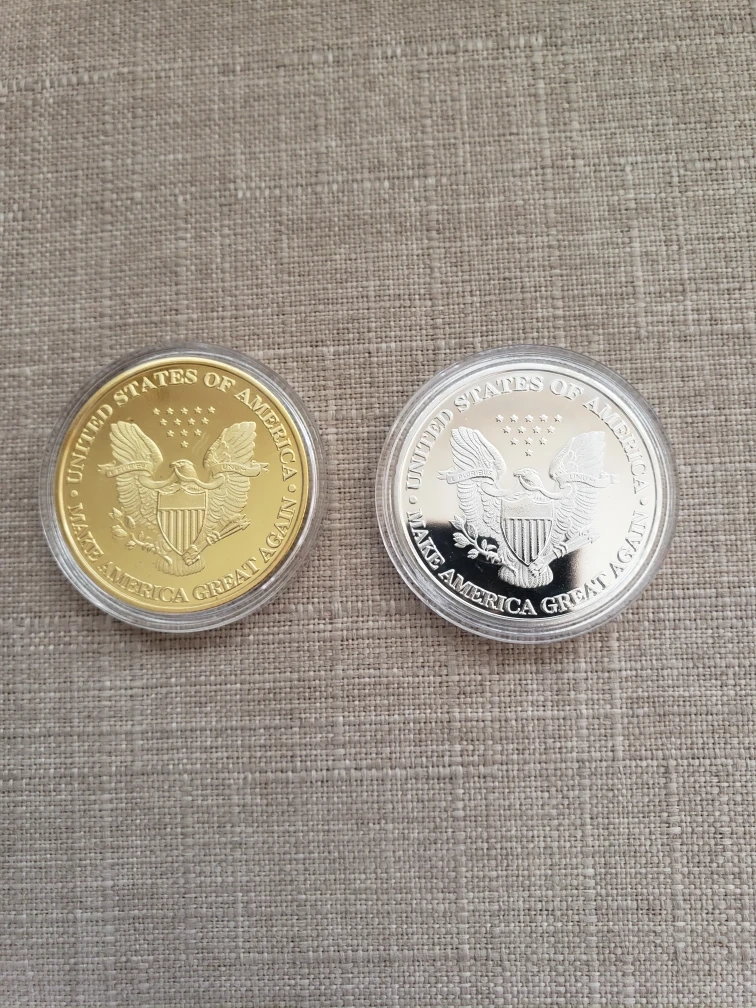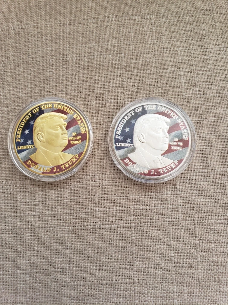 Two collectible coins featuring Donald J. Trump. One gold, one silver. Showcasing presidential imagery and patriotic designs. In protective cases. $10 each.