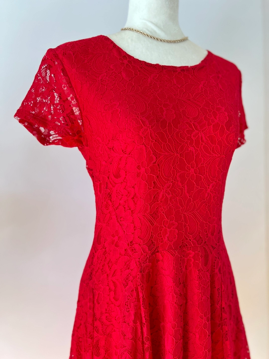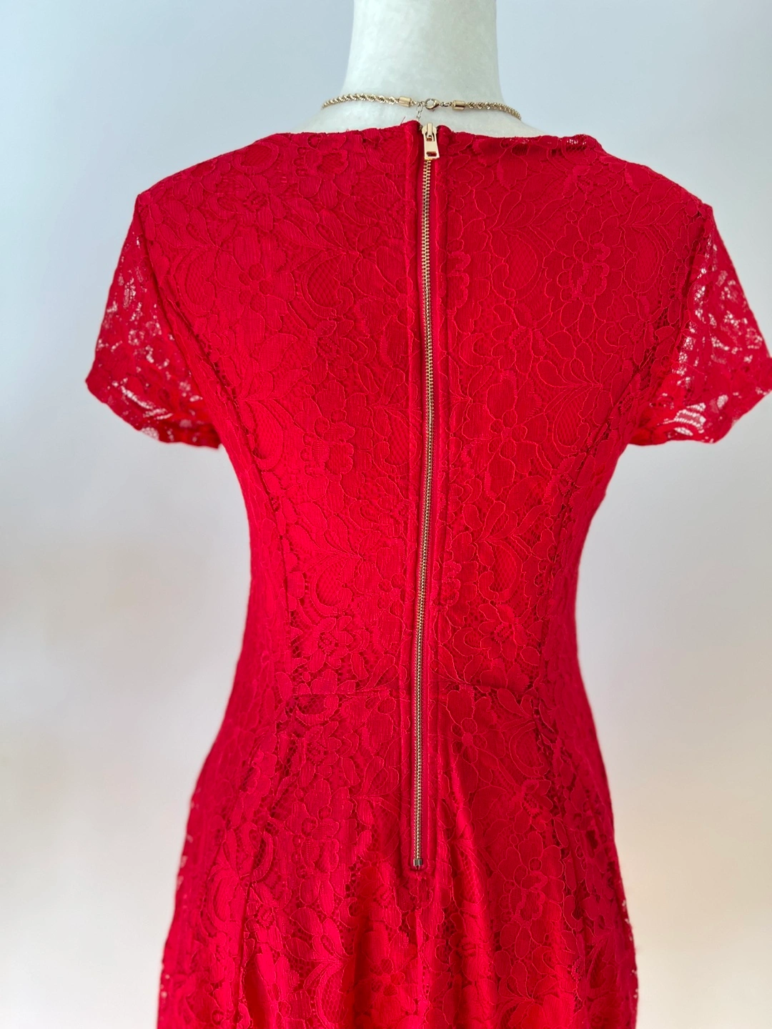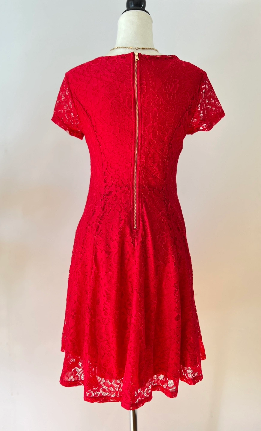 Beautiful red lace dress. Short sleeves, fit and flare silhouette. Gold Back zipper closure. Perfect for a special occasion.
