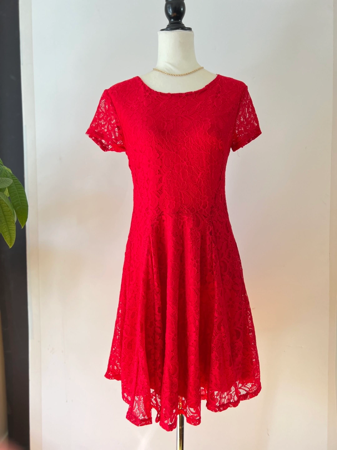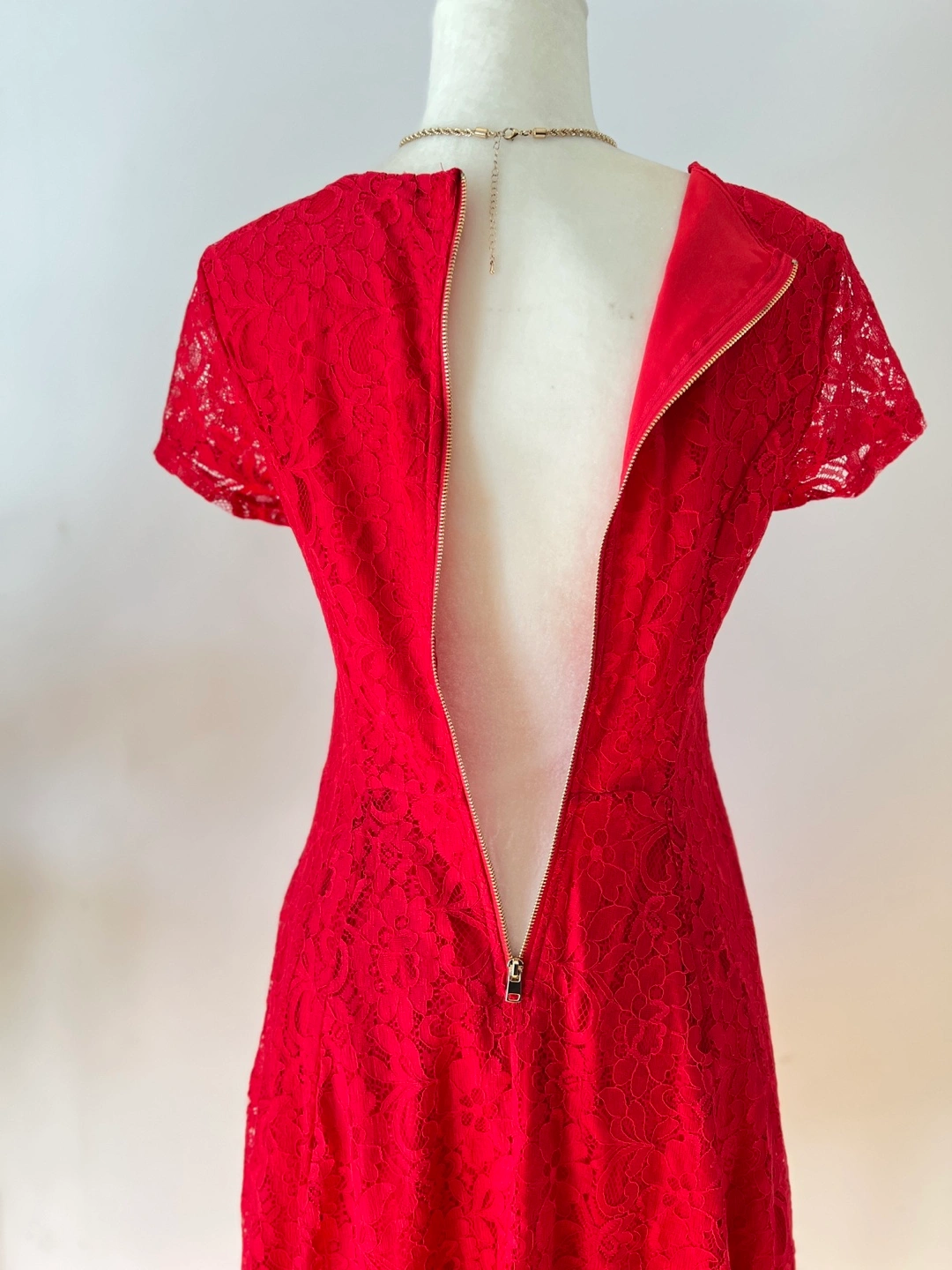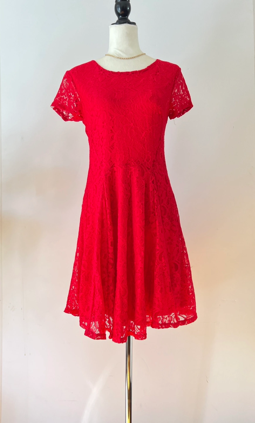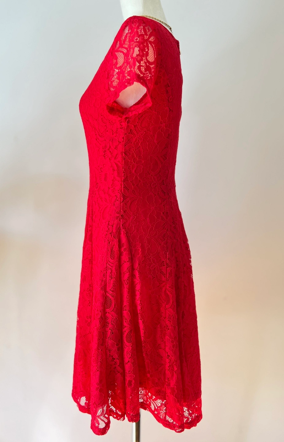 Beautiful red lace dress. Short sleeves, fit and flare silhouette. Gold Back zipper closure. Perfect for a special occasion.