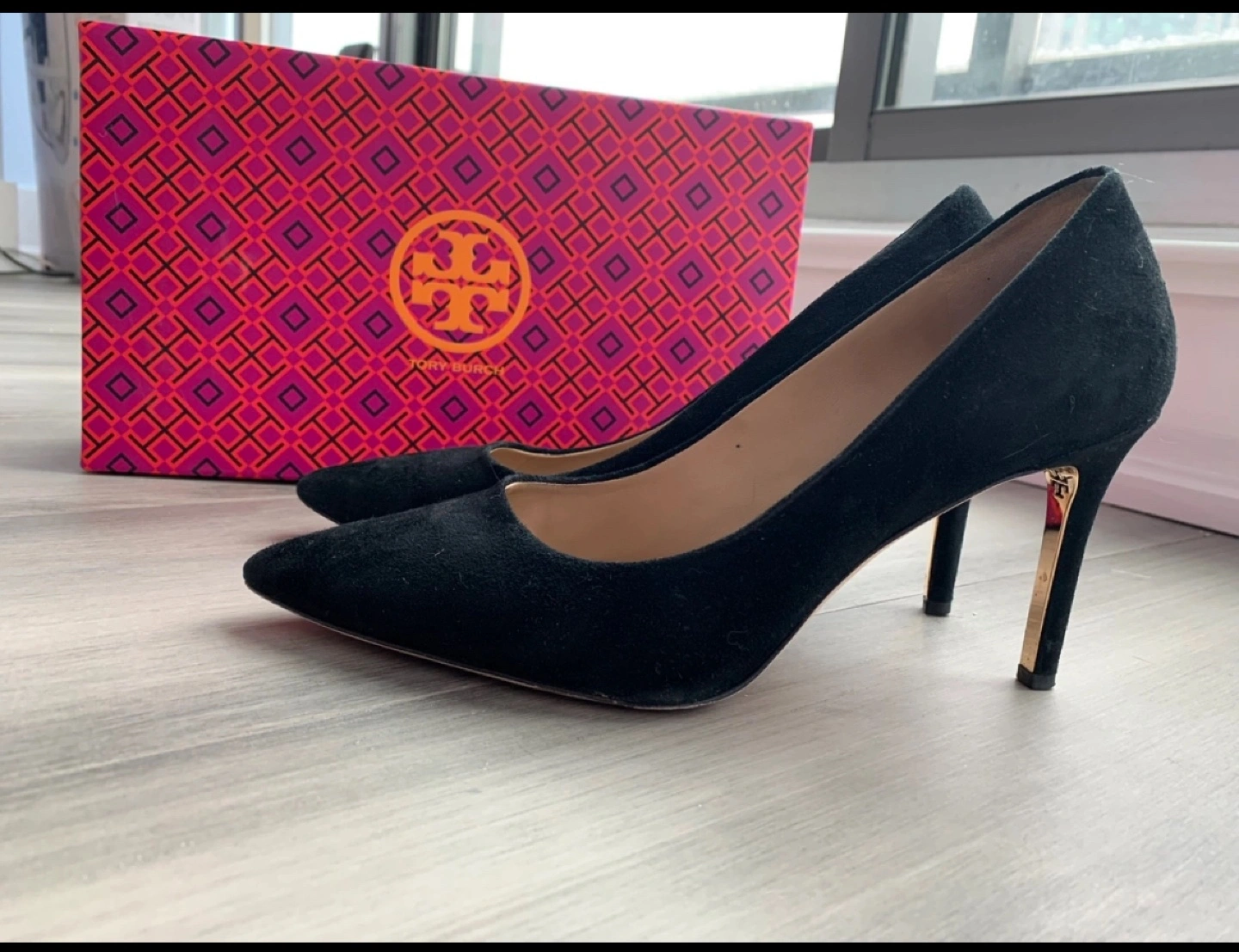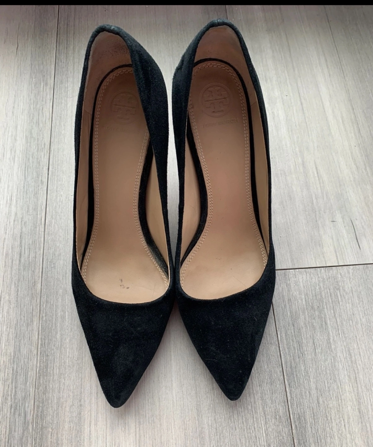 Black suede heels. Pointed toe. Size 7.5M. Gold heel detail. Pre-owned, minor wear.