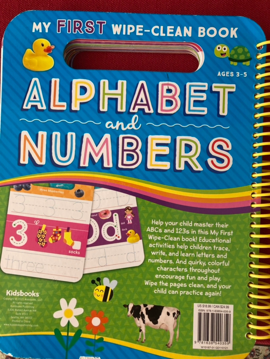 Wipe-clean activity book for ages 3-5. Features ABCs, 123s, colourful characters, and playful activities. Includes one wipe-clean pen. Excellent practice reusable many times. I have many kids stuff. If buy two of them this will be 5$
