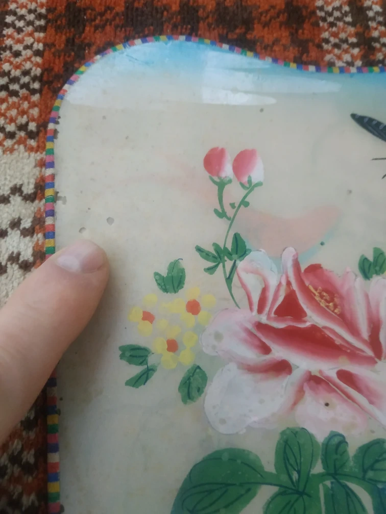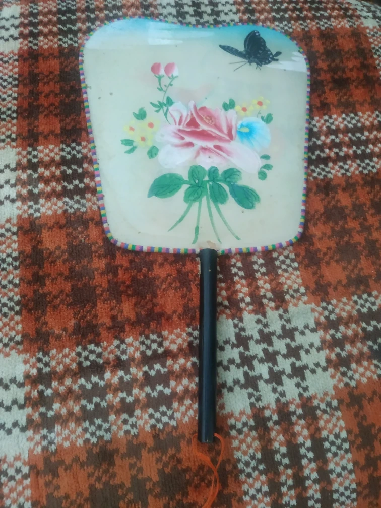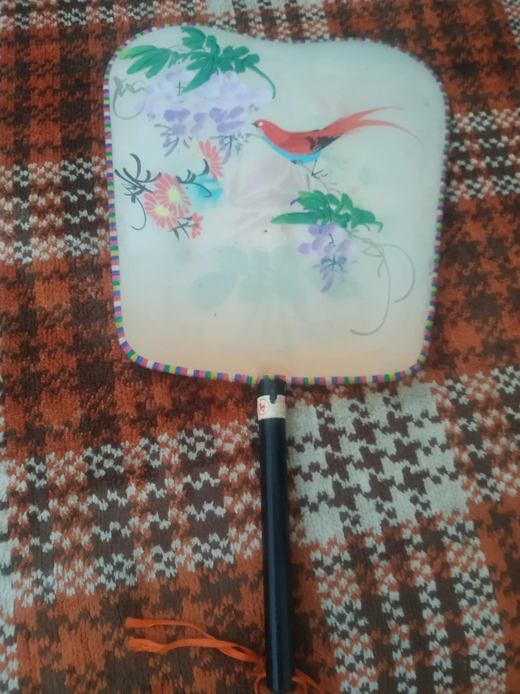 lovely vintage hand-painted folding fans. Floral designs, one features a butterfly and the other a bird. Black handles and colourful details. Unique collectible items. Third photo showing two very tiny little tears in the fabric.