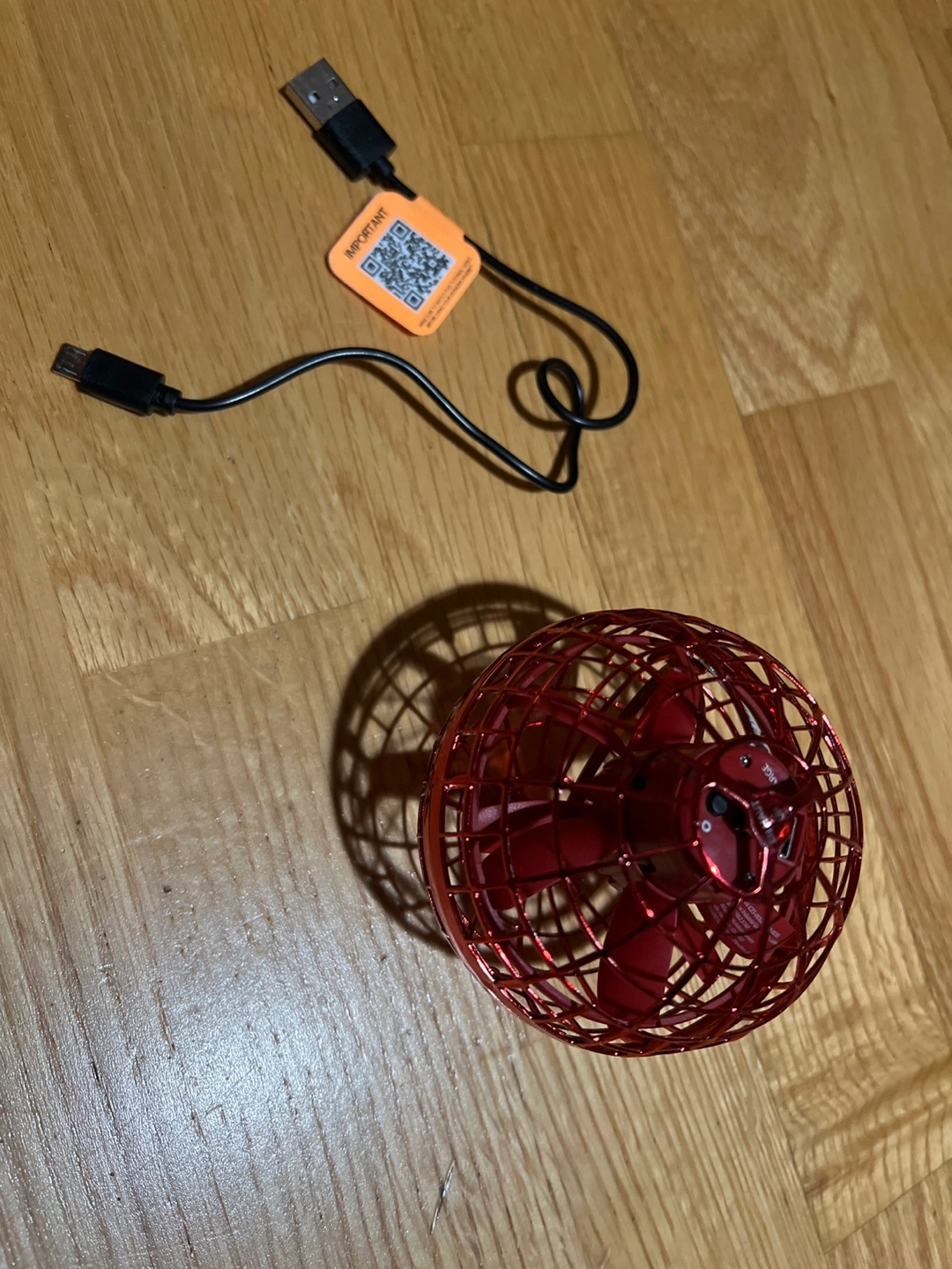 Red mini drone, looks like a small helicopter. Includes USB charging cable. Fun for kids and adults.