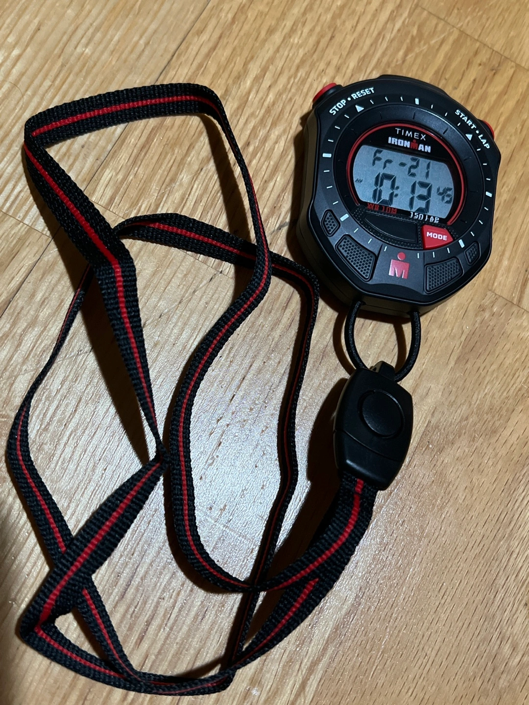 Black Ironman stopwatch with red accents. Includes lanyard. Digital display. Multiple functions. Works great. For sale