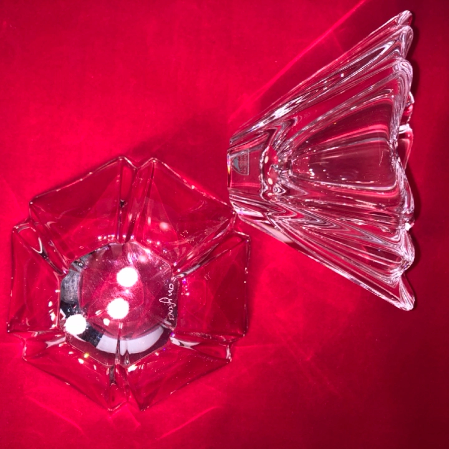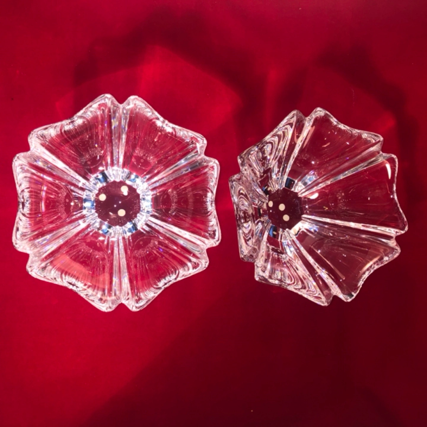 Stunning, signed Orrefors Orion 6-sided crystal bowls/candle holders. 5 1/2” diameter. These are one of the prettiest patterns from Swedish crystal maker Orrefors, as they catch the light beautifully! Vintage, in like-new condition-ready for your table, or to give as a gift. Lovely Scandinavian decor! Asking $45 each, or both for $75. (Please note the white dots are felt, and removable.)