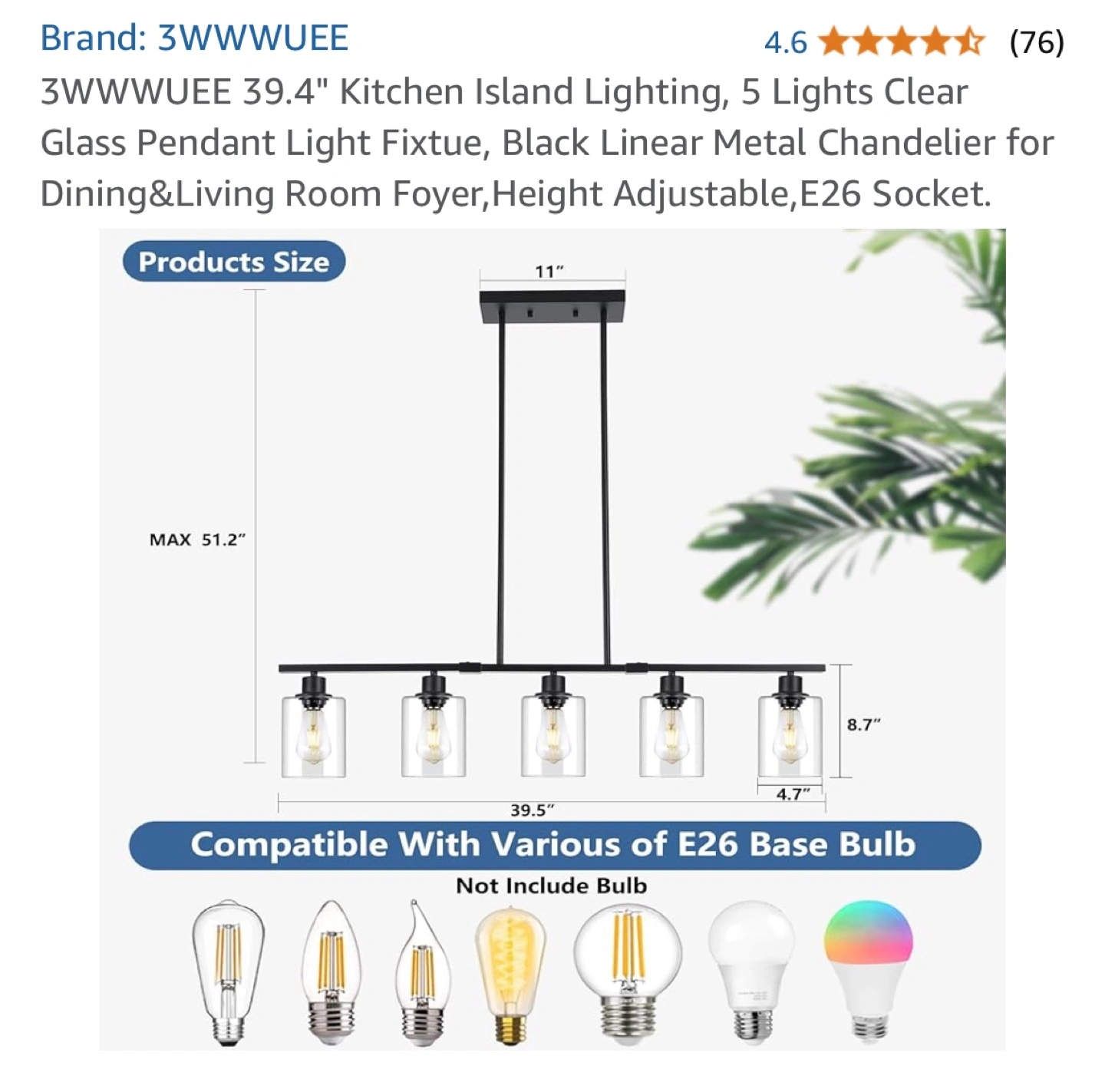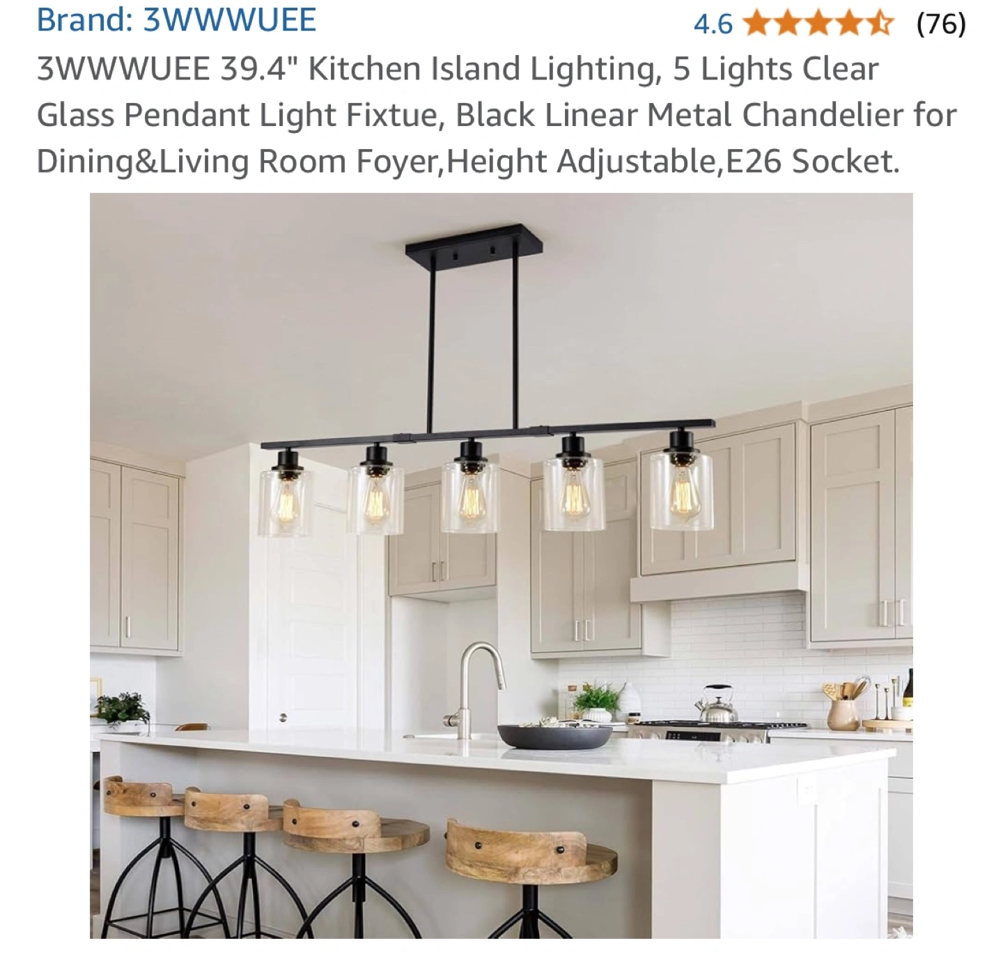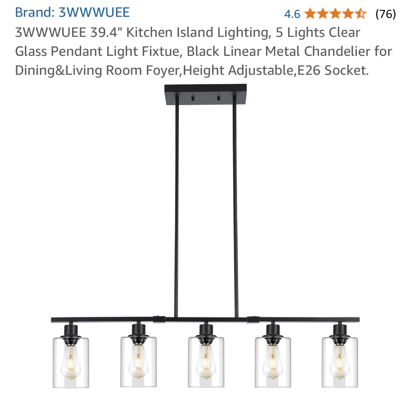 Brand 3WWWUEE Colour Black Material Glass, Metal Style Farmhouse Light fixture form Island Room type Kitchen, Dining Room Farmhouse And Industrial Design: 5 Lights linear Glass chandelier features an elegance with black finish and clear glass shade which offers a signature focal point for various home decor. Large pendant light will be eye-catching and adds farmhouse, coastal and transitional style spaces. Height Adjustable: kitchen island lighting size is 39.5”, Max Height is 51.2”. this light fixtures offers 2pcs 5.9” removable rods and 6pcs 11.8” rods. You can adjust this island light for 7 height to suit for different ceiling height. The different height is 16”,21.9”,27.8”,33.7’,39.6”,45.6” and 51.2 Bulbs: This vintage island pendant light requires 5 x E26 Medium Base Bulbs(60W Maximum per bulb). Fully compatible with LED, Incandescent, CFL Bulb (Bulb NOT included), Recommend using 60W equivalent LED vintage filament style bulbs. Easy to install: this dining room light fixtures comes all necessary mounting hardware, you can install the light fixtures within 10 minutes, without complex installation steps and complex tools Wide Application:rectangle island light offers enough brightness for your room, ideal for r kitchen island, dining room, over dining table, living room, bar, pool table, restaurants etc large space. This farmhouse lighting fixtures will add a beautiful accent to any decor. It is a perfect Christmas gift choice for your family, and for yourself