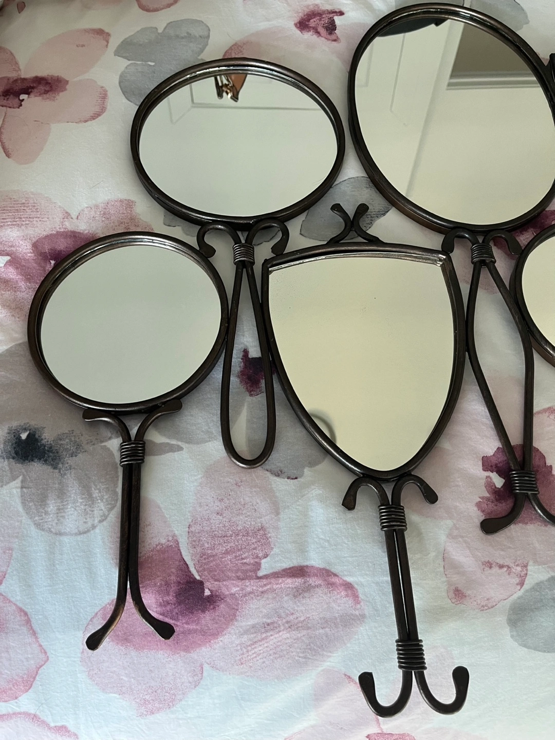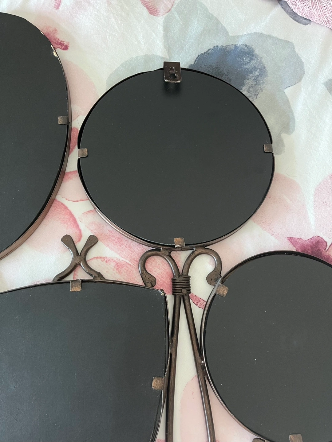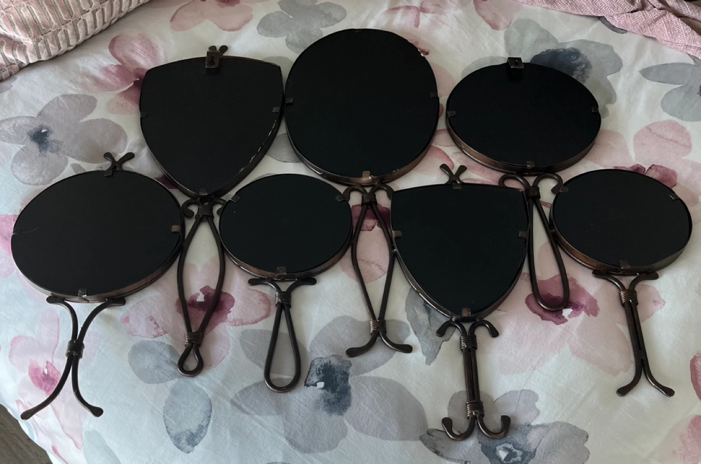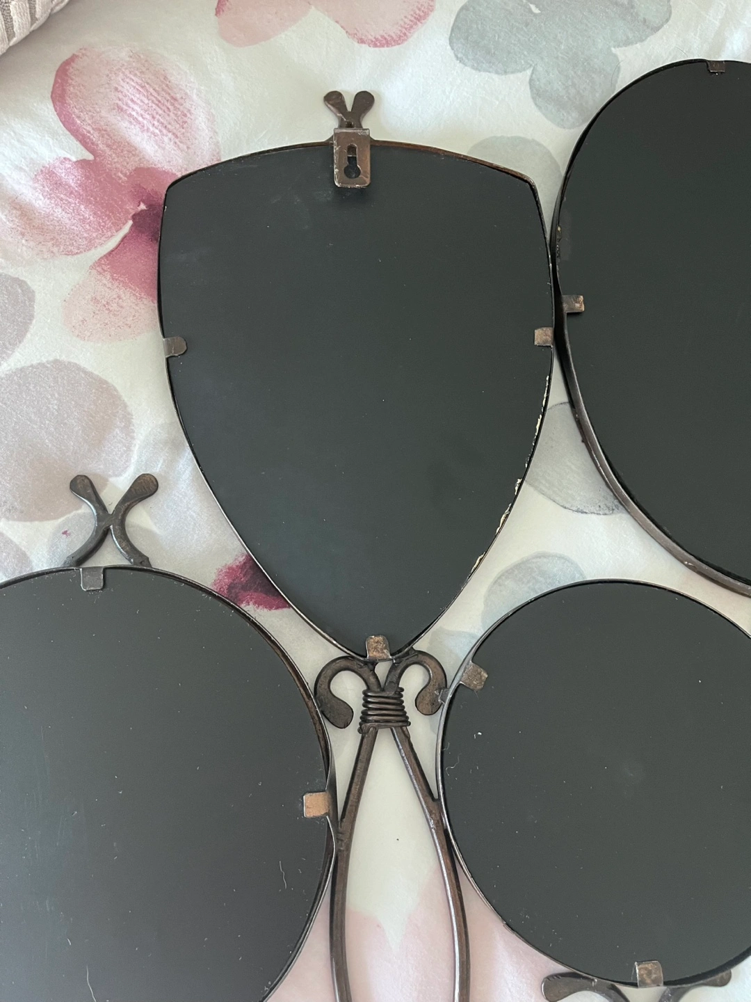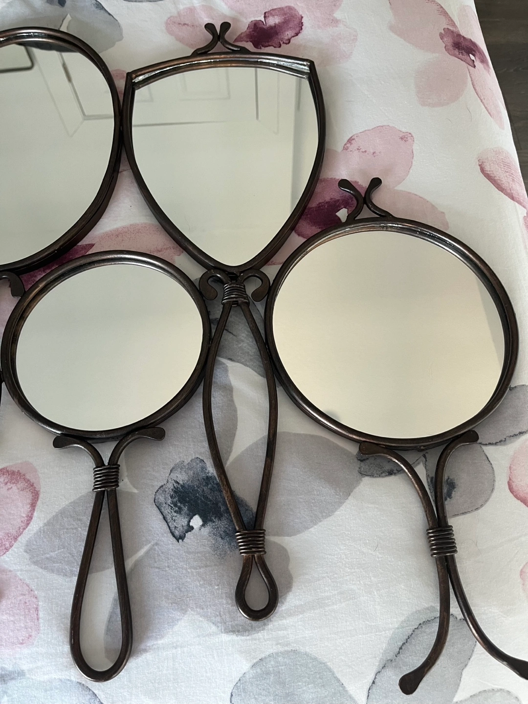 Unique mirror wall decor - 7 diff iron/metal hand-held mirrors welded together as one piece. From Pier One. 32” at widest x 26” at tallest, pick up in Liberty Village. It is called dreaming mirror perfect decor piece.
