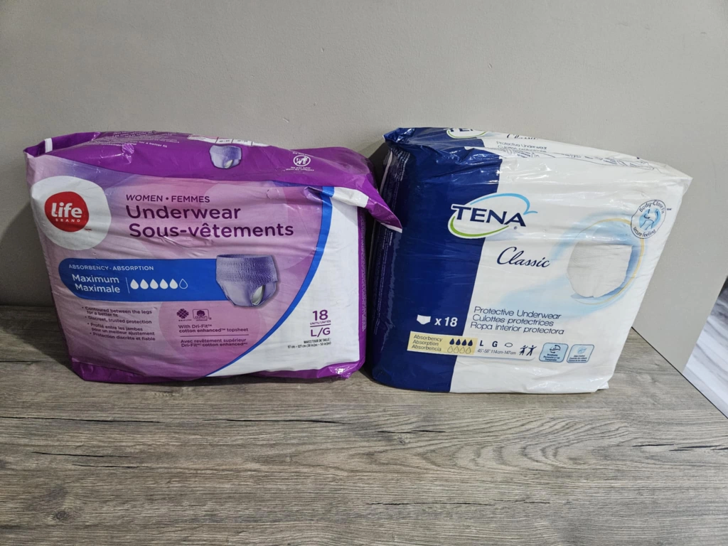 18 count packages of women's underwear. One package is Life Brand Maximum absorbency and the other is TENA Classic protective underwear. Large/X-Large size.