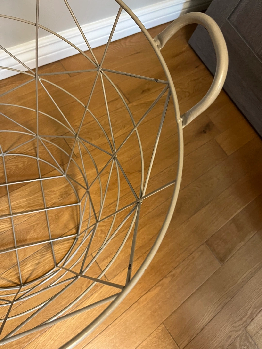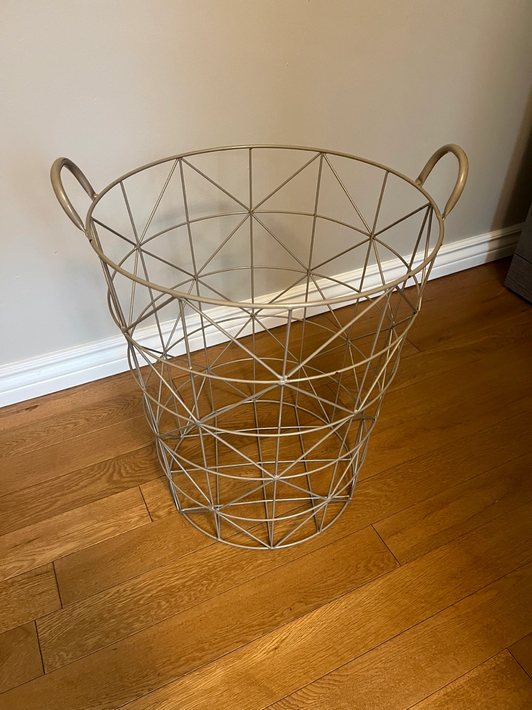 Pick up in Liberty Village, 23 inches in height to the handle, 17 inches in diameter, light wire basket, bronze colour, has some chips per pictures. Geometric design. Two handles. Ideal for storage or laundry.
