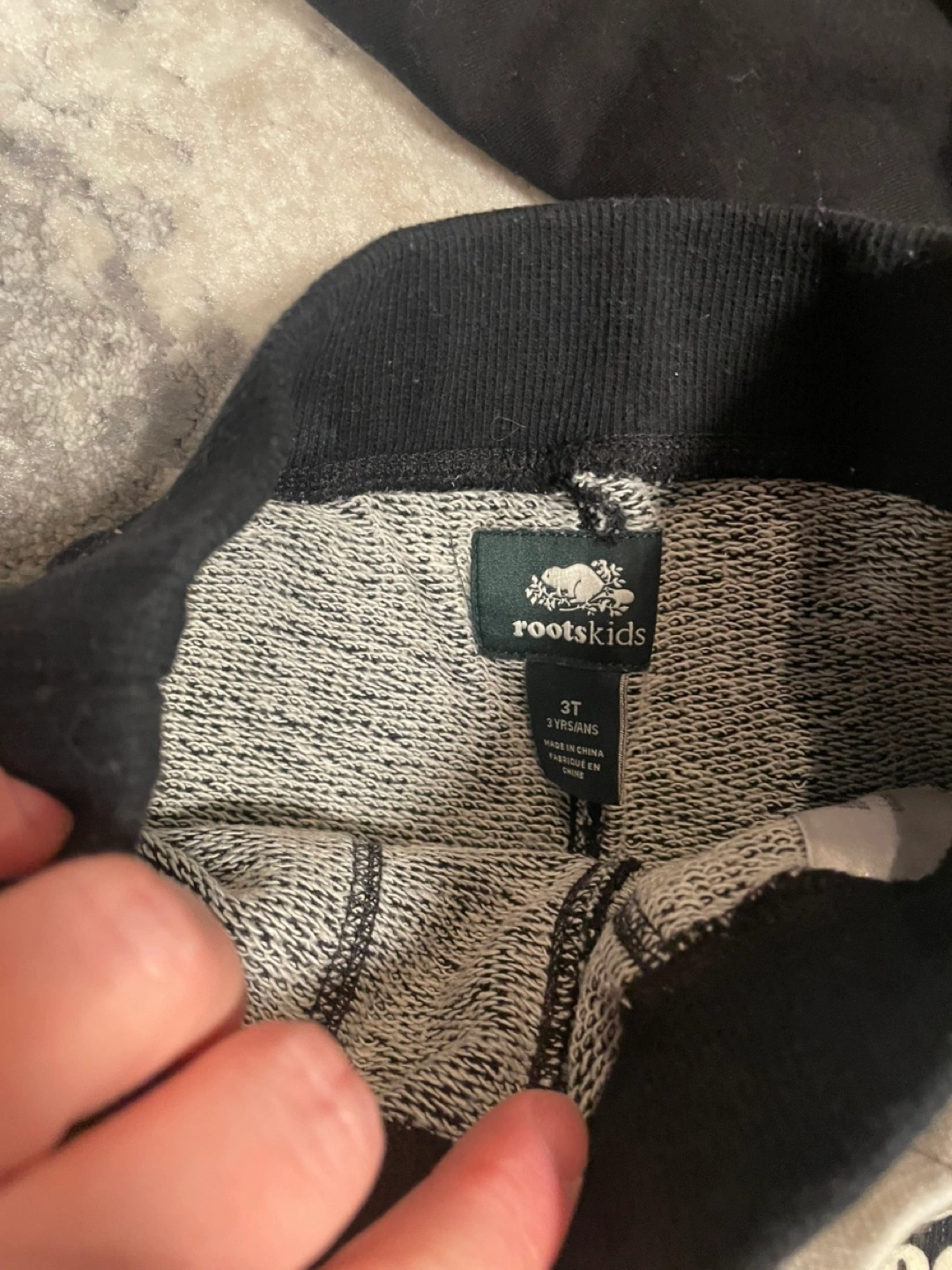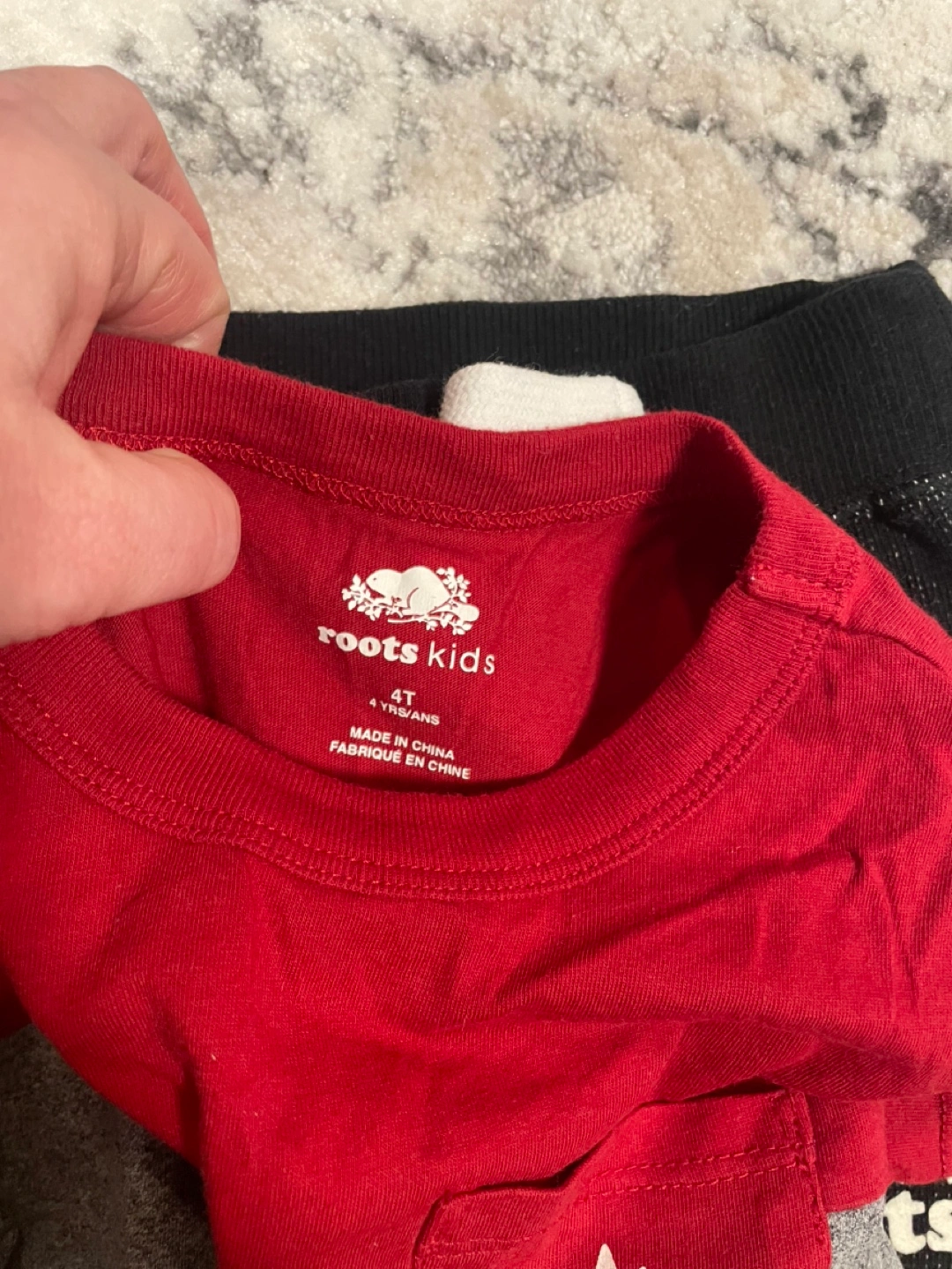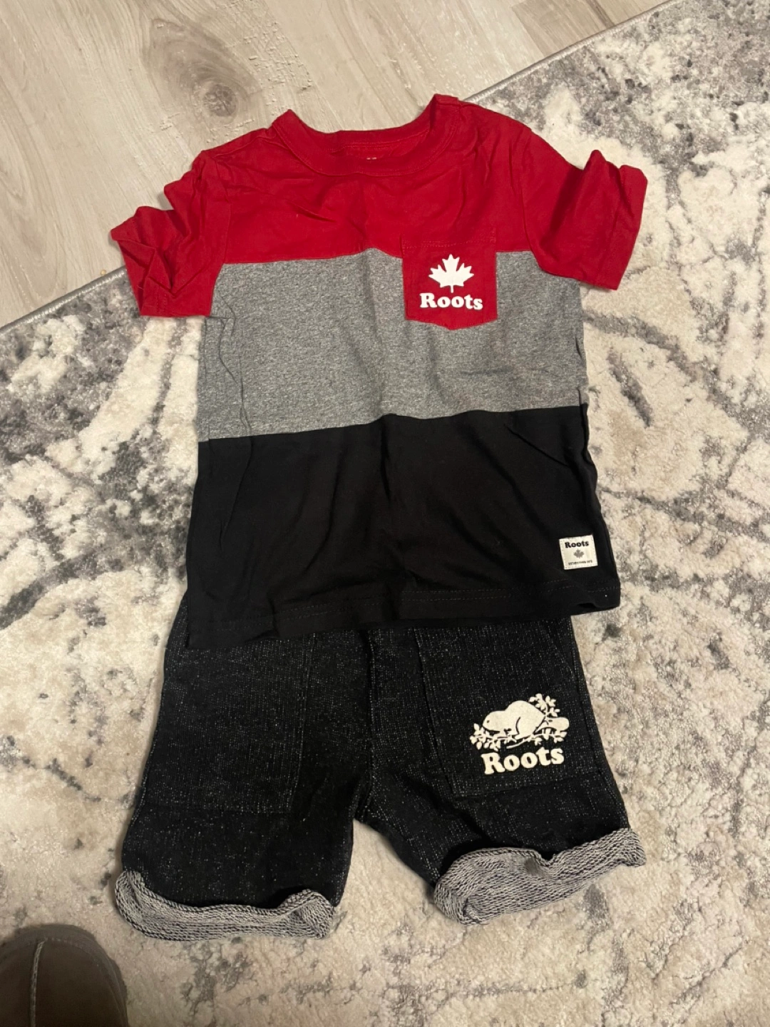 Adorable Roots Kids outfit. Includes a red, grey and black shirt and a pair of black denim shorts. Size 3T. Great condition.
