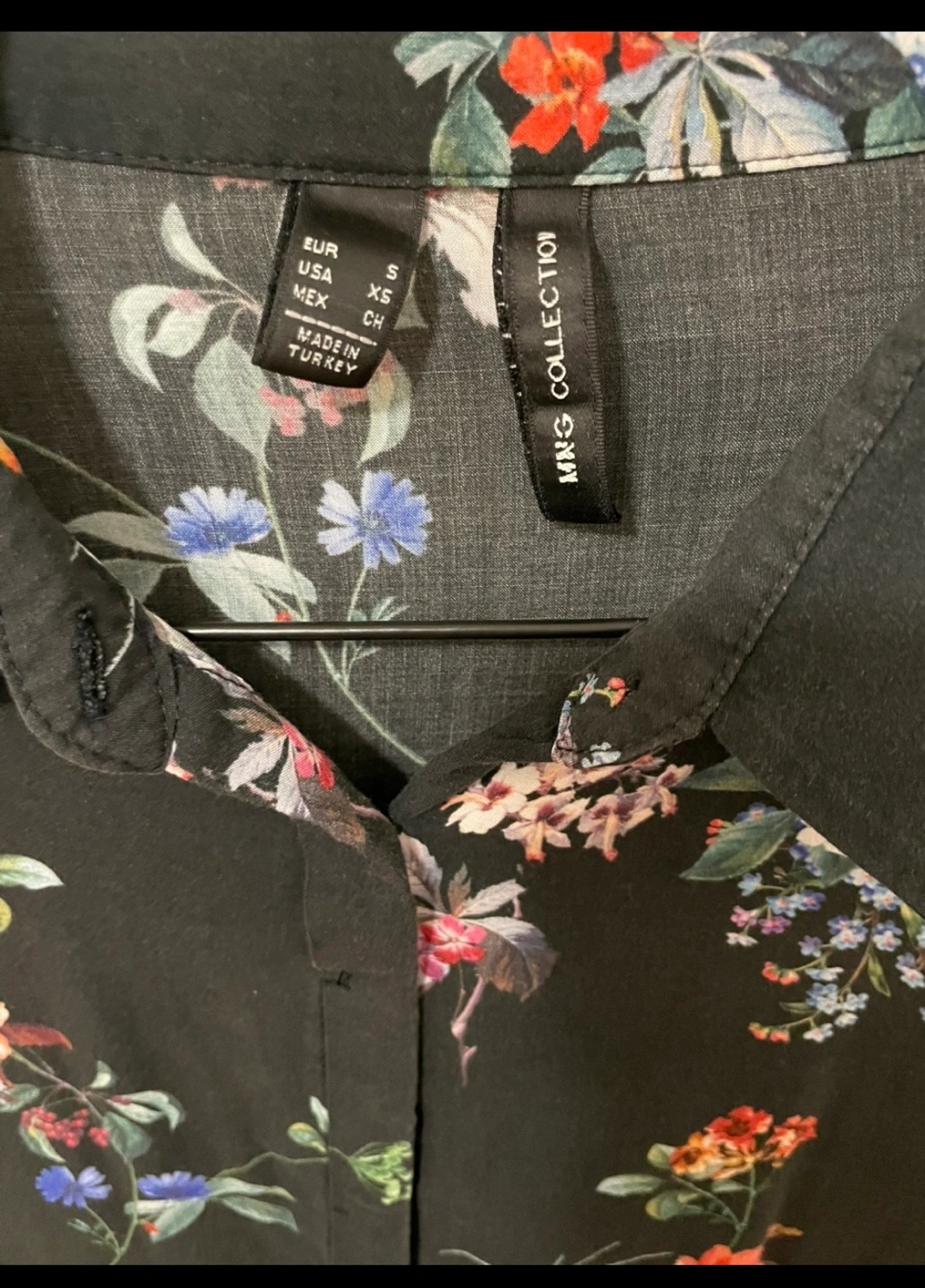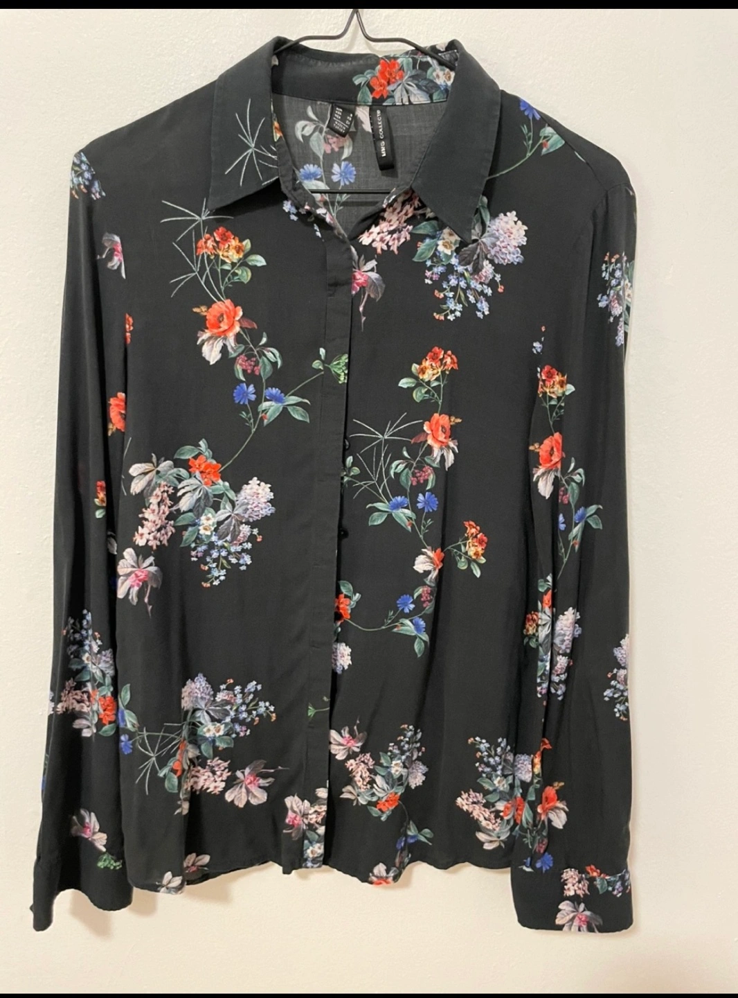 Long-sleeved button-up shirt. Dark coloured base with colourful floral pattern. Size small.