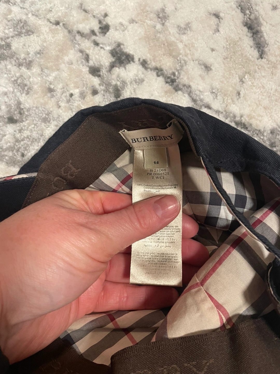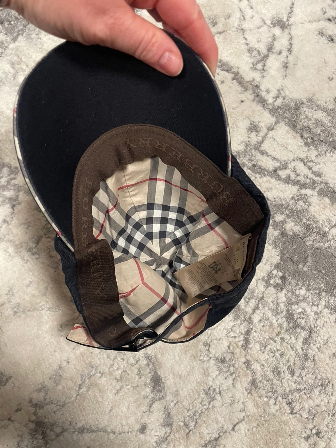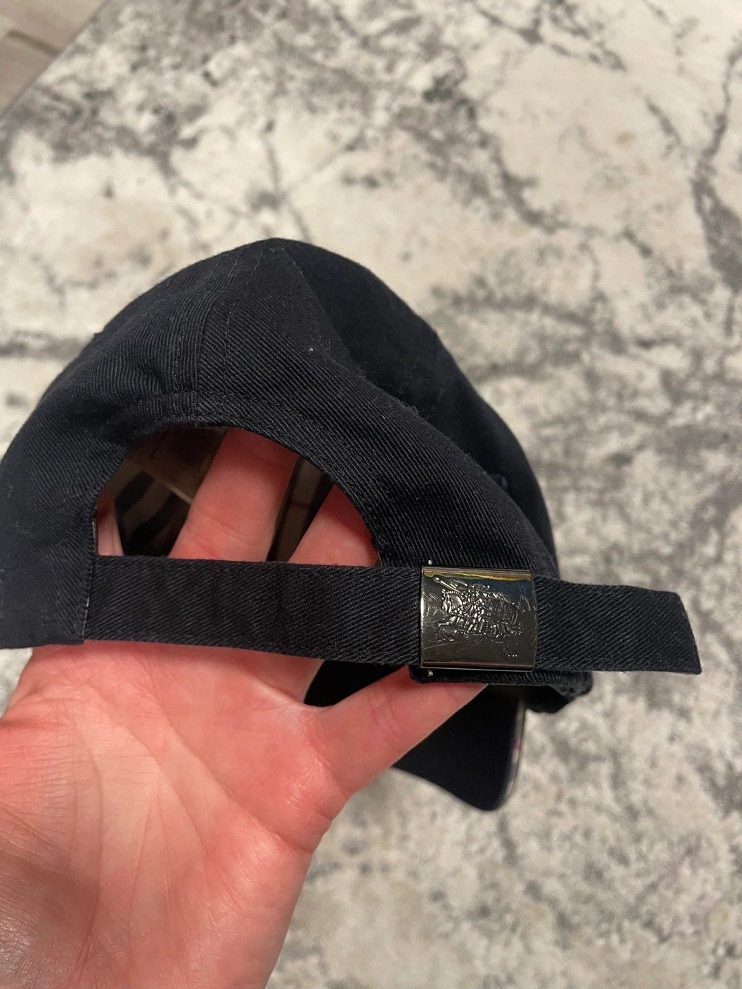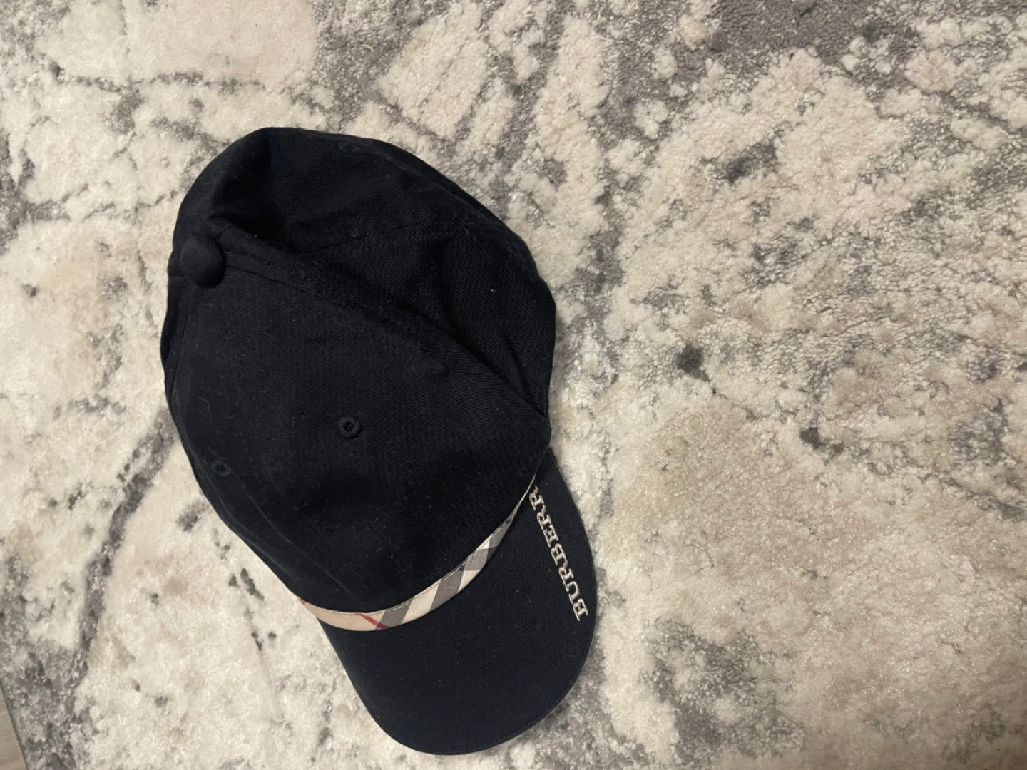 Black navy Burberry baseball cap. Features a classic check pattern on the underside of the brim and inside. Adjustable back strap. Gently used, excellent condition.
