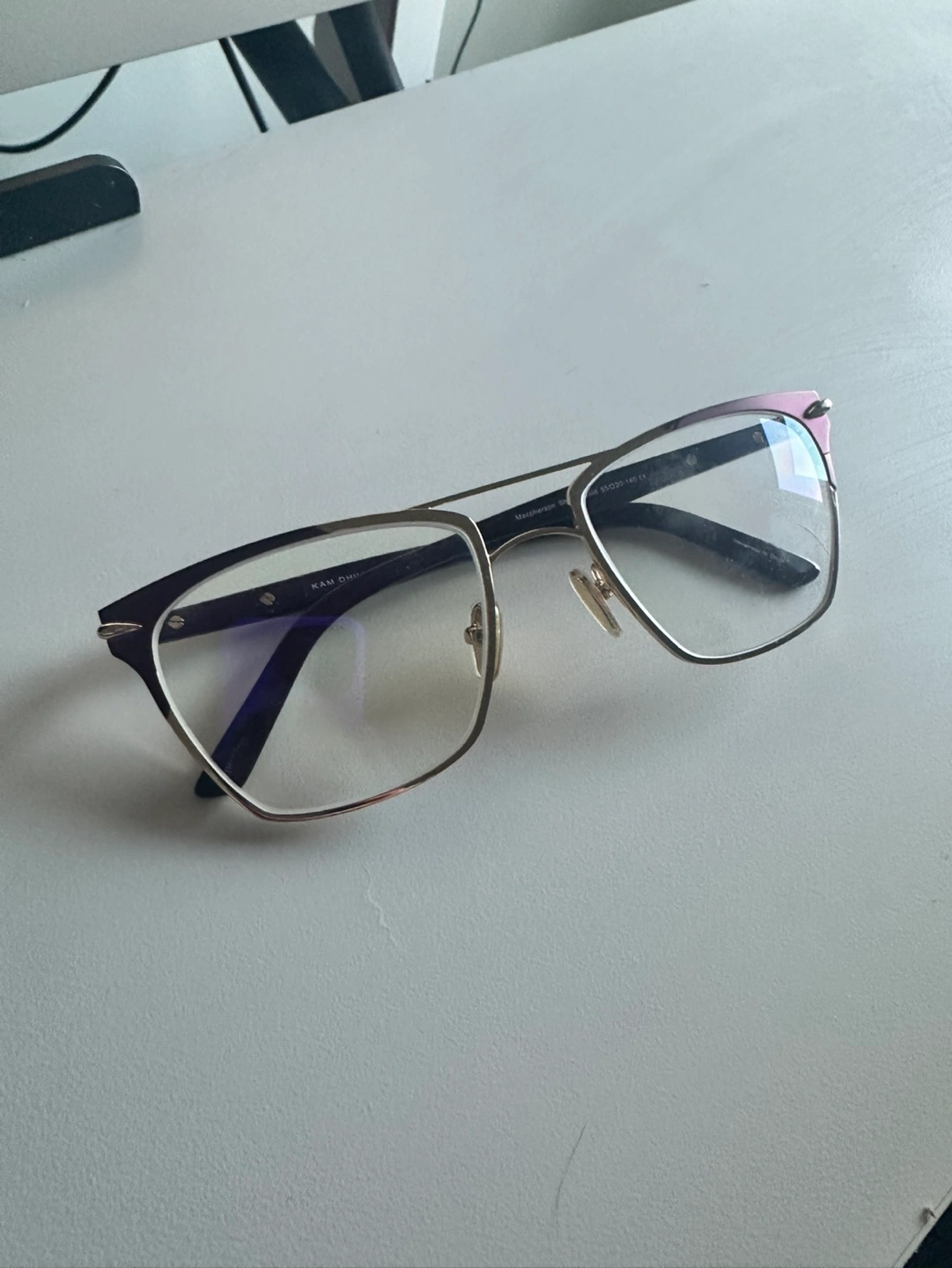 High quality frames Current prescription is -0.5 left eye, -1.75 right eye. Could bring to a glasses store to swap out the lenses. Magenta and gold colour. More of an oversized/larger frame look. Hardly worn.
