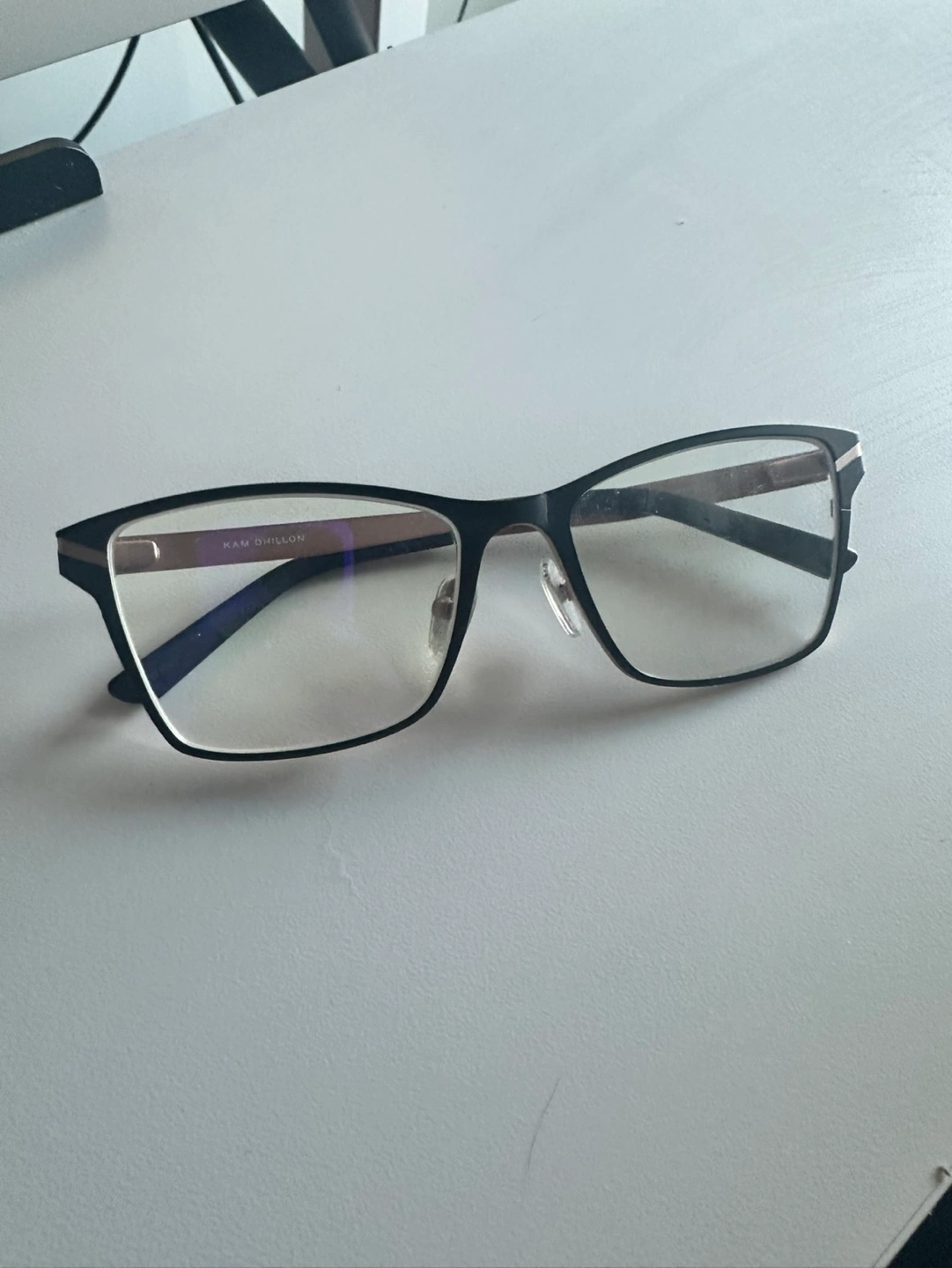 High quality frames Current prescription is -0.5 left eye, -1.75 right eye. Could bring to a glasses store to swap out the lenses. Black and gold Brand is Kam Dhillon - purchased on clearly.ca Larger oversized look. Hardly worn.