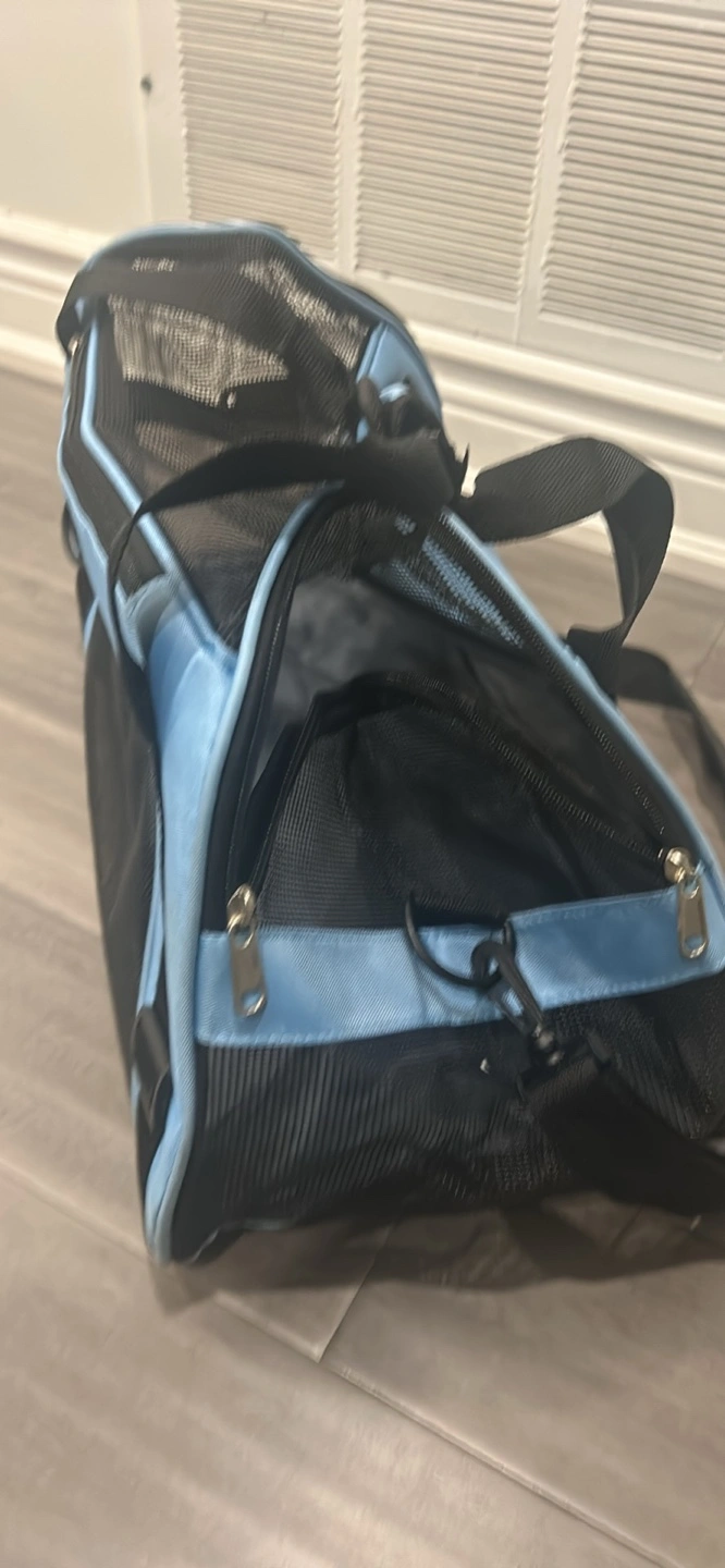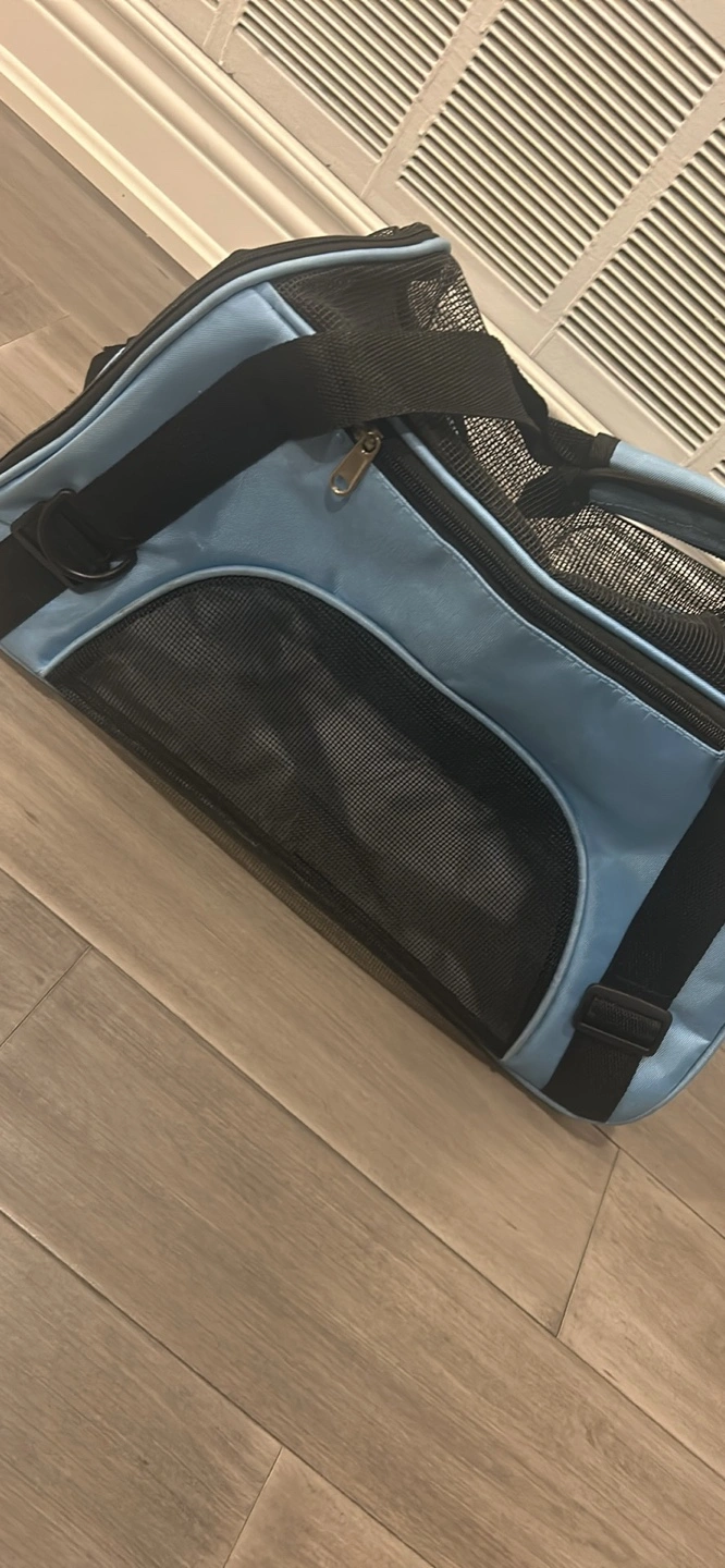Blue and black pet carrier. Soft-sided carrier with mesh windows. Zippers and straps. Great for small pets.