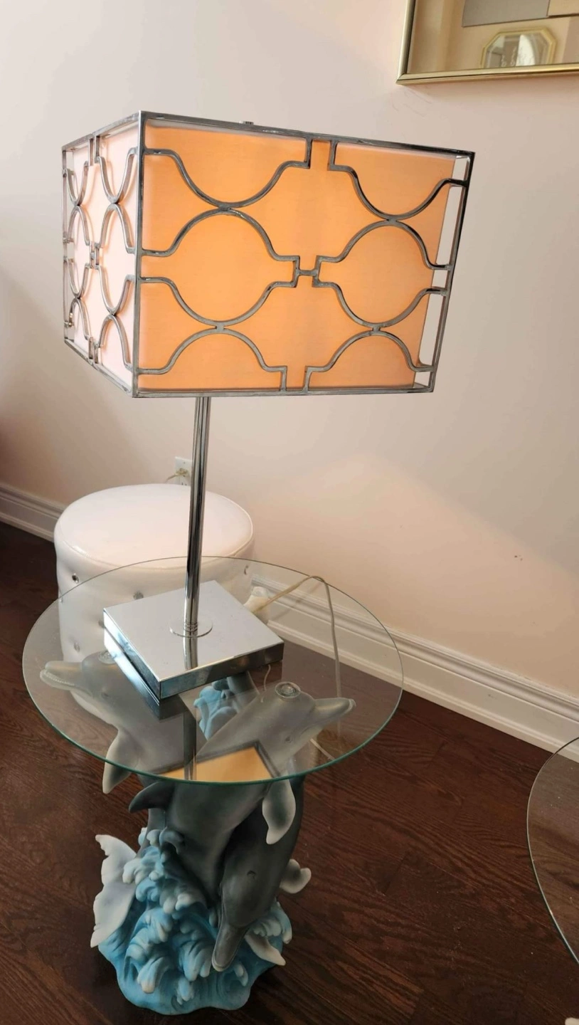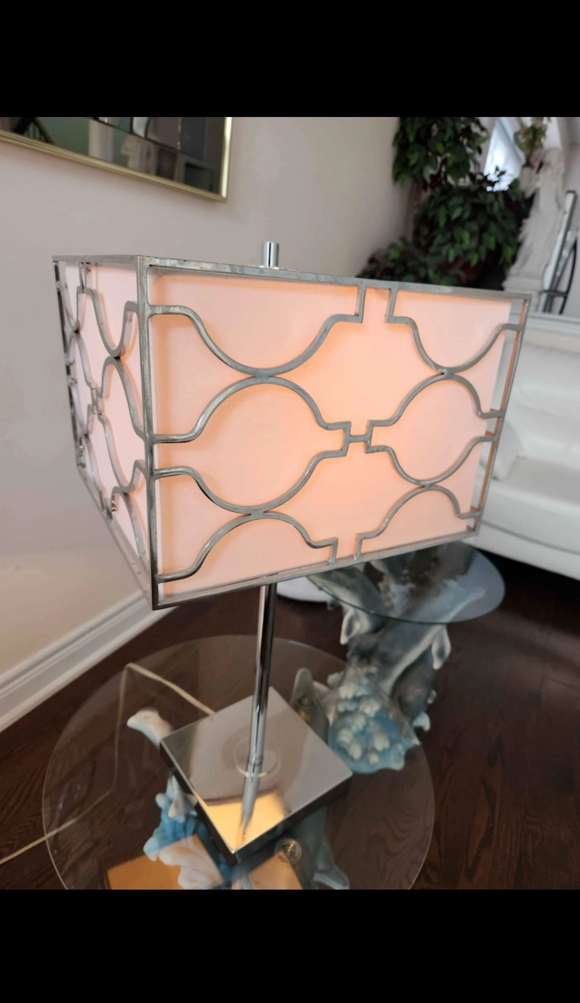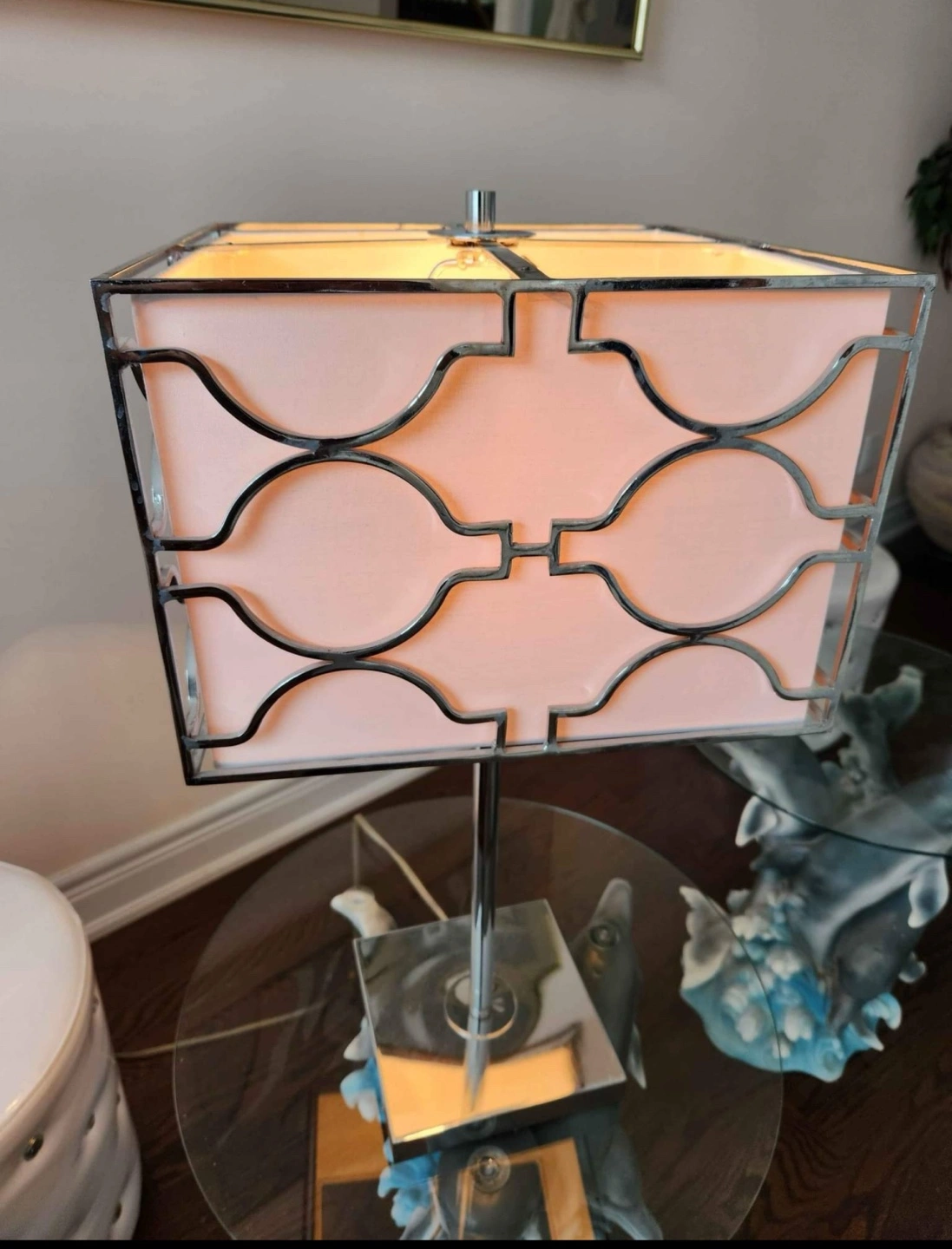 Stylish table lamp. Chrome finish. Square base and shade. Pink fabric shade with geometric cutouts. Great accent piece for any room.