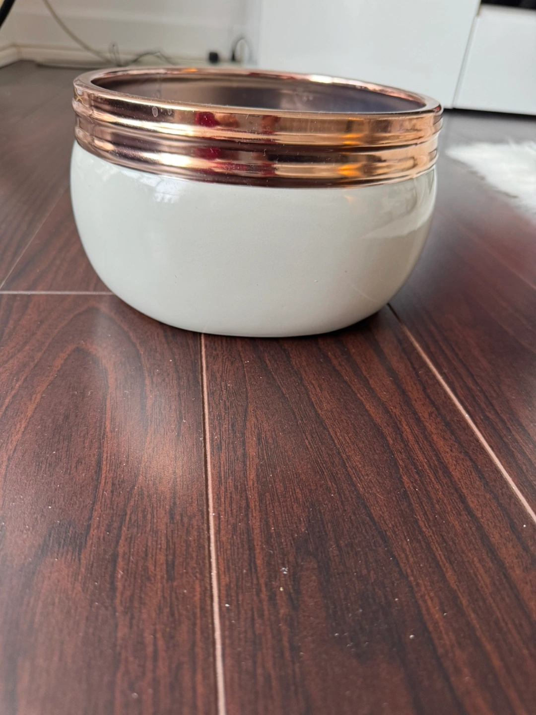 Round ceramic bowl. Light green body with rose gold coloured metallic accents around the rim. Great for displaying items or as a decorative piece. You can also put flowers or plant. Pick up at Steeles/ Bathurts