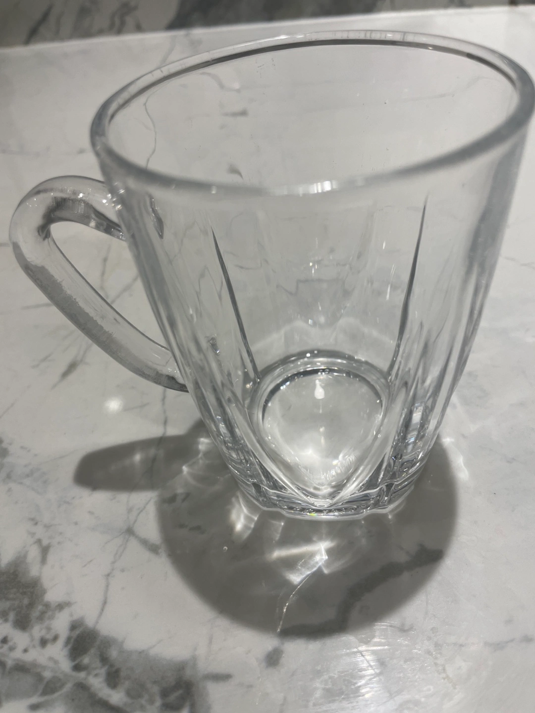 Set of fifteen clear glass mugs. Small, elegant design. Perfect for coffee, tea, or hot chocolate. Durable and easy to clean.