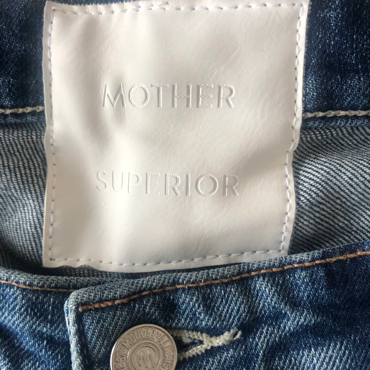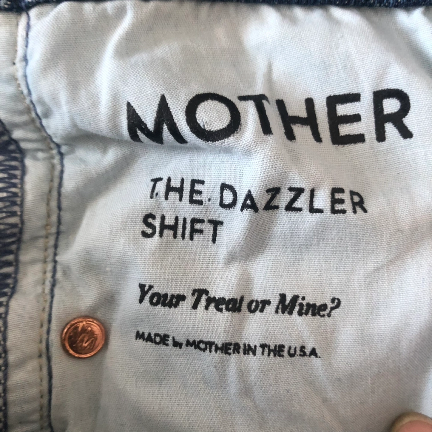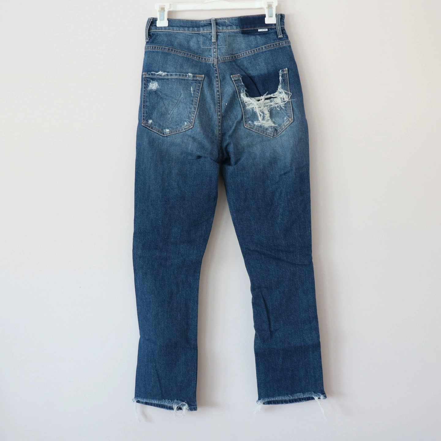 High-waisted distressed denim jeans. Stepped waist. Multiple rips and tears throughout. Cropped length. Medium wash. Size 27