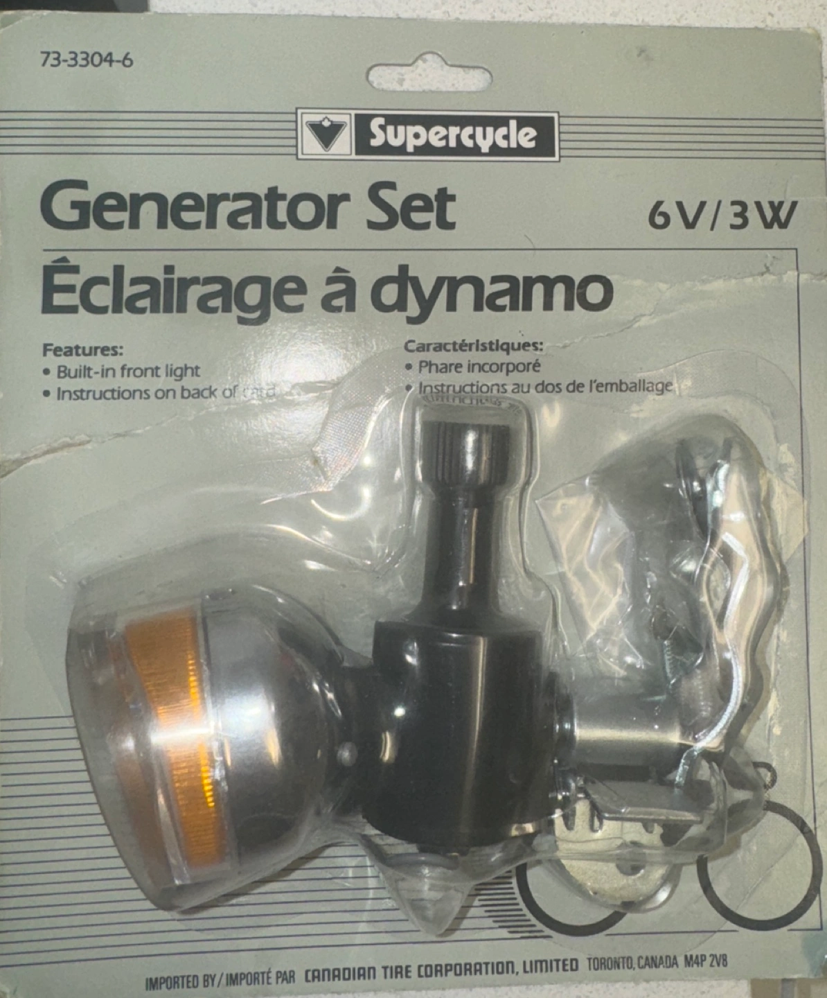 Vintage bicycle light set. 6V/3W. Includes front light and instructions. Dynamo powered. Canadian Tire Corporation.