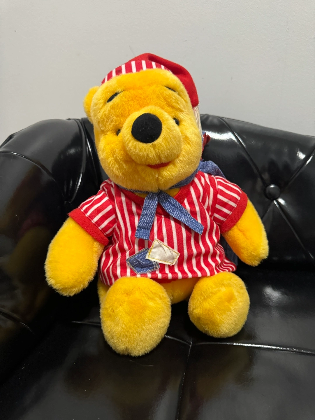 Adorable Winnie the Pooh plush toy. Wearing red and white striped pyjamas and a matching hat. Soft and cuddly. Great for collectors or children.