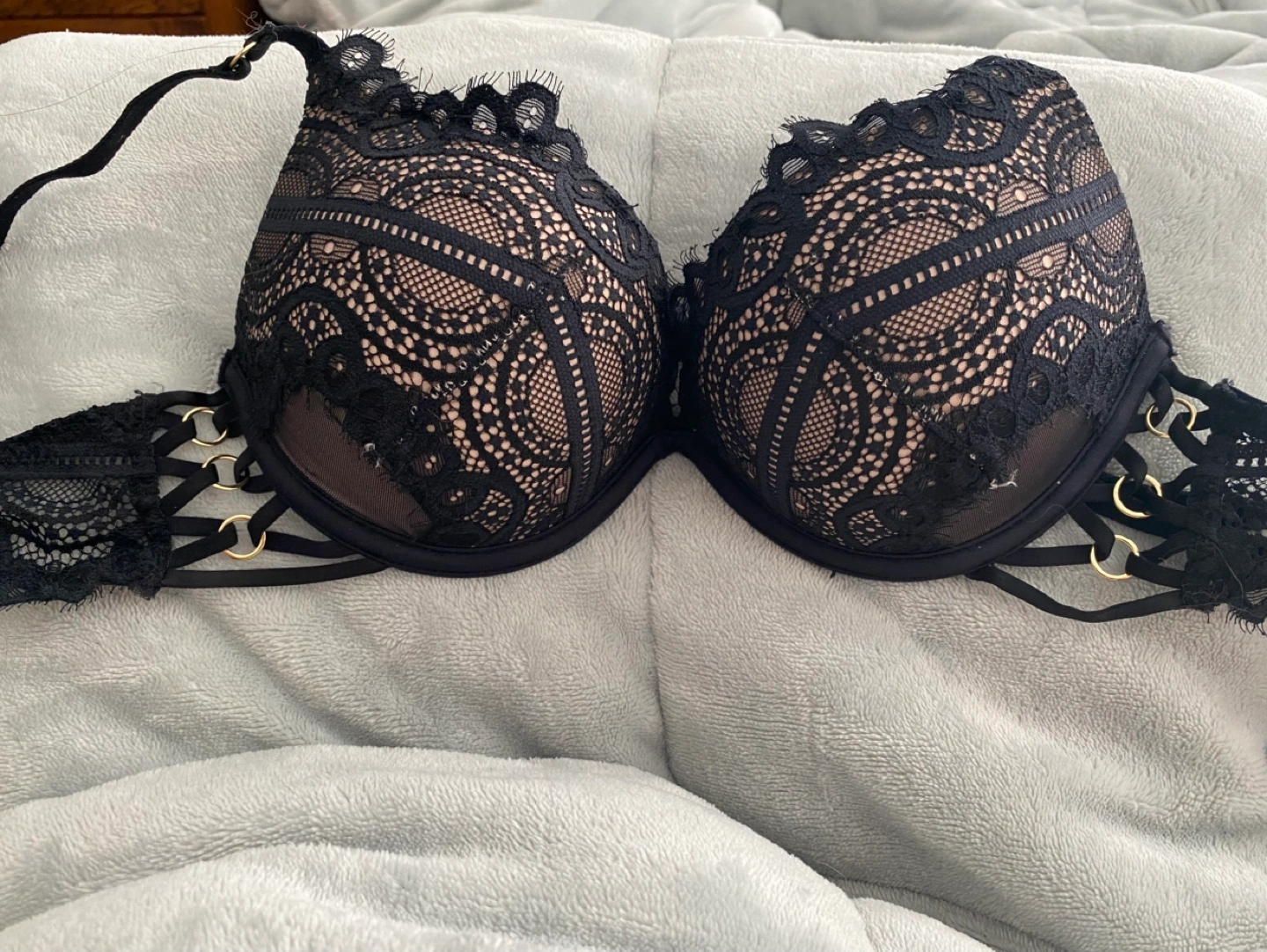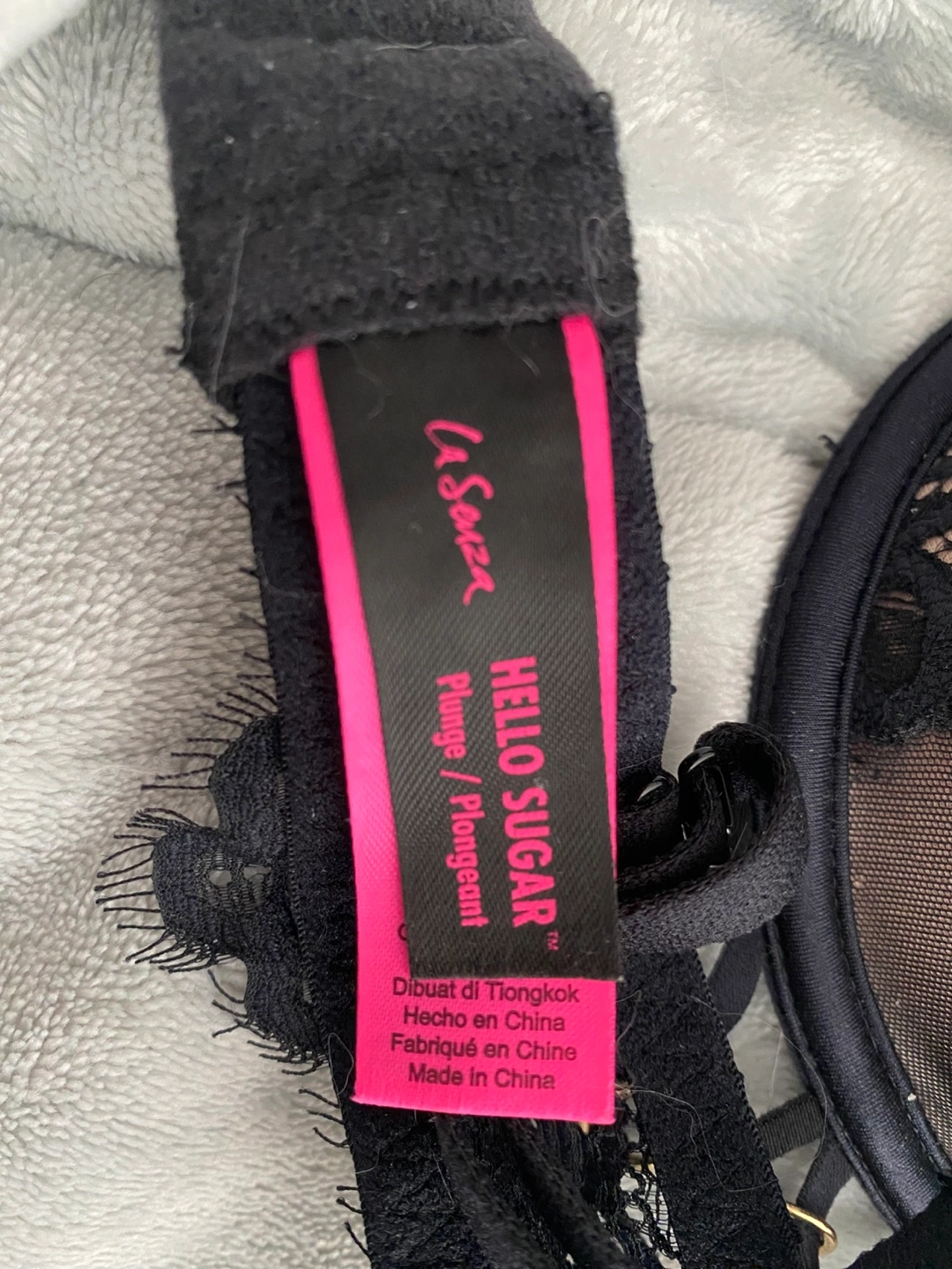 Black lace plunge bra. Features gold-toned hardware. Size 32B. NWOT Never worn