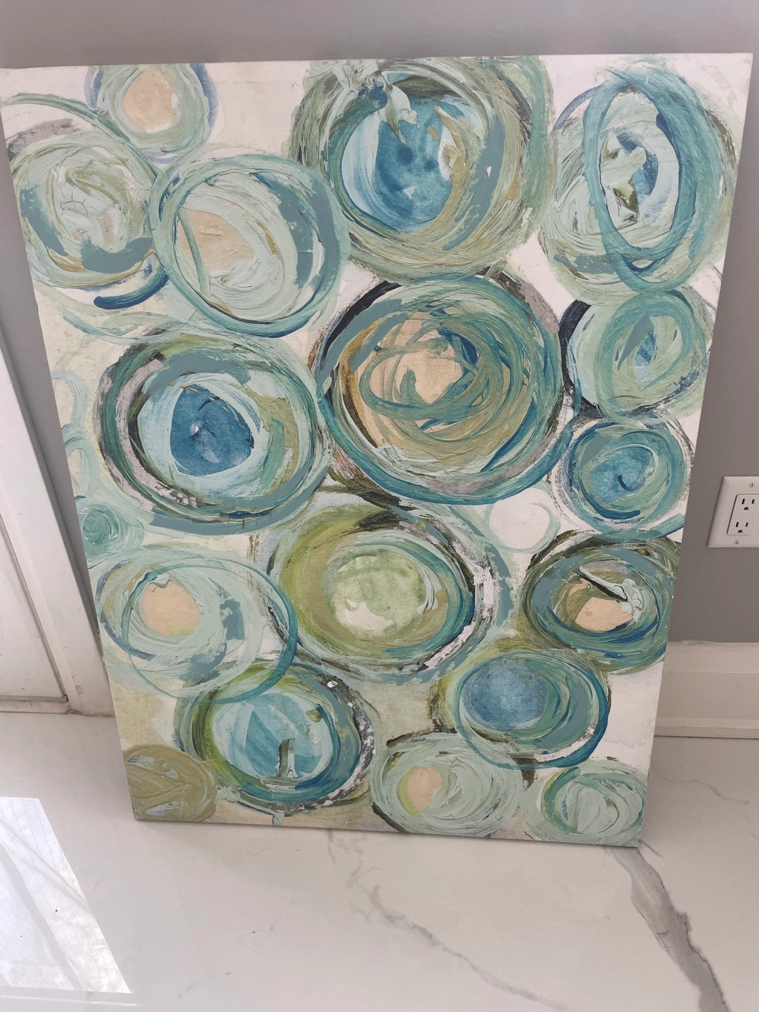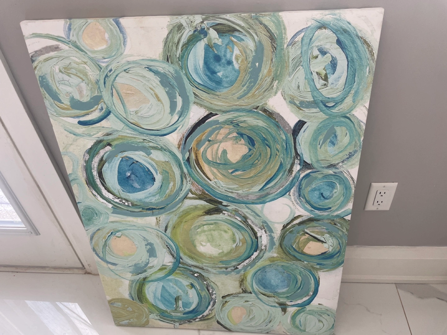 Beautiful abstract painting. Teal, green, and beige colours. Canvas on a wooden frame. Great statement piece for any room.