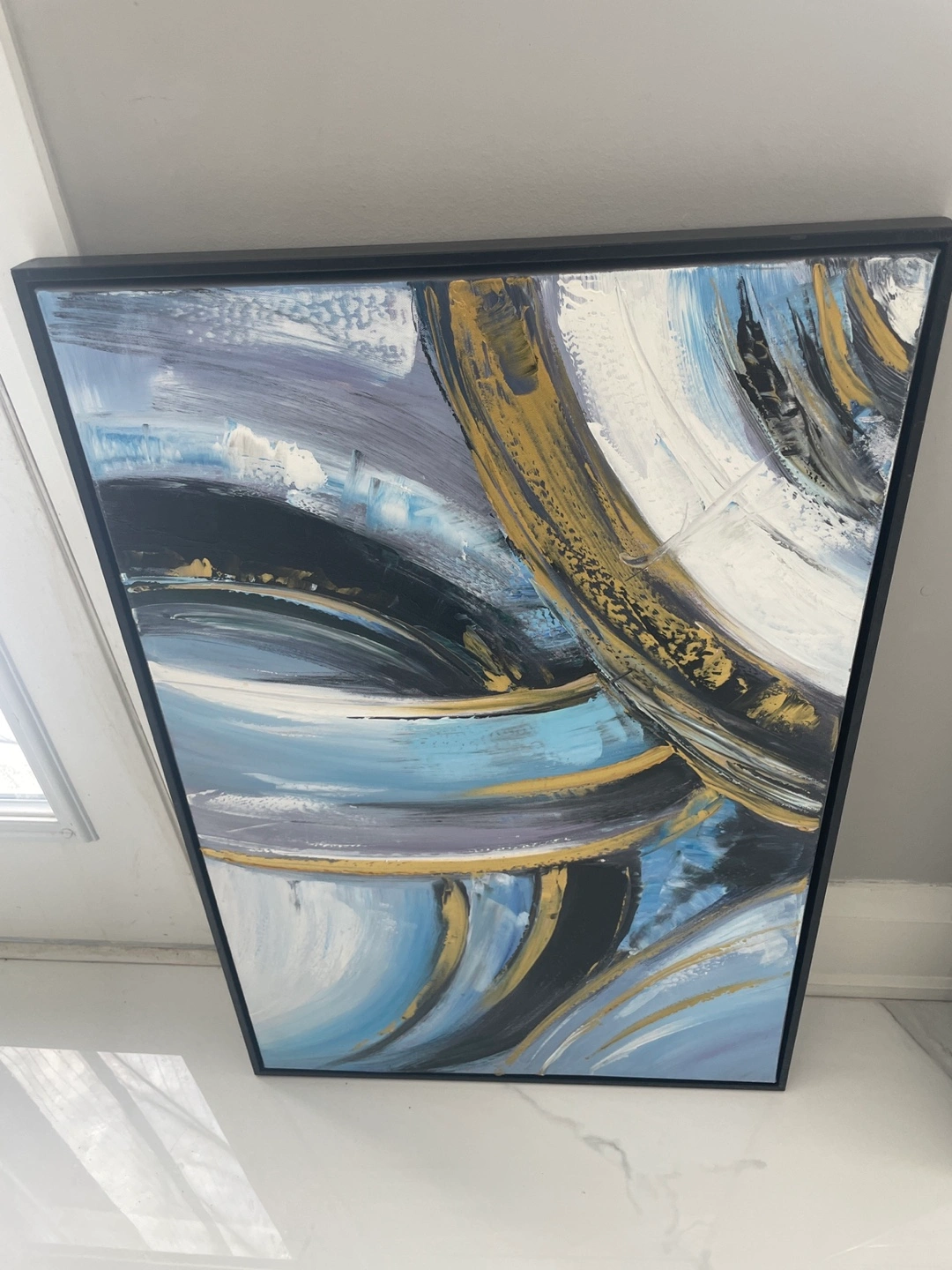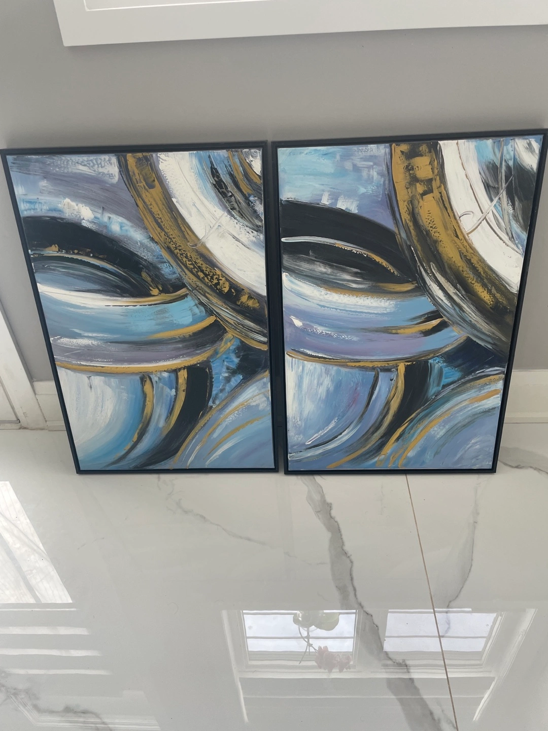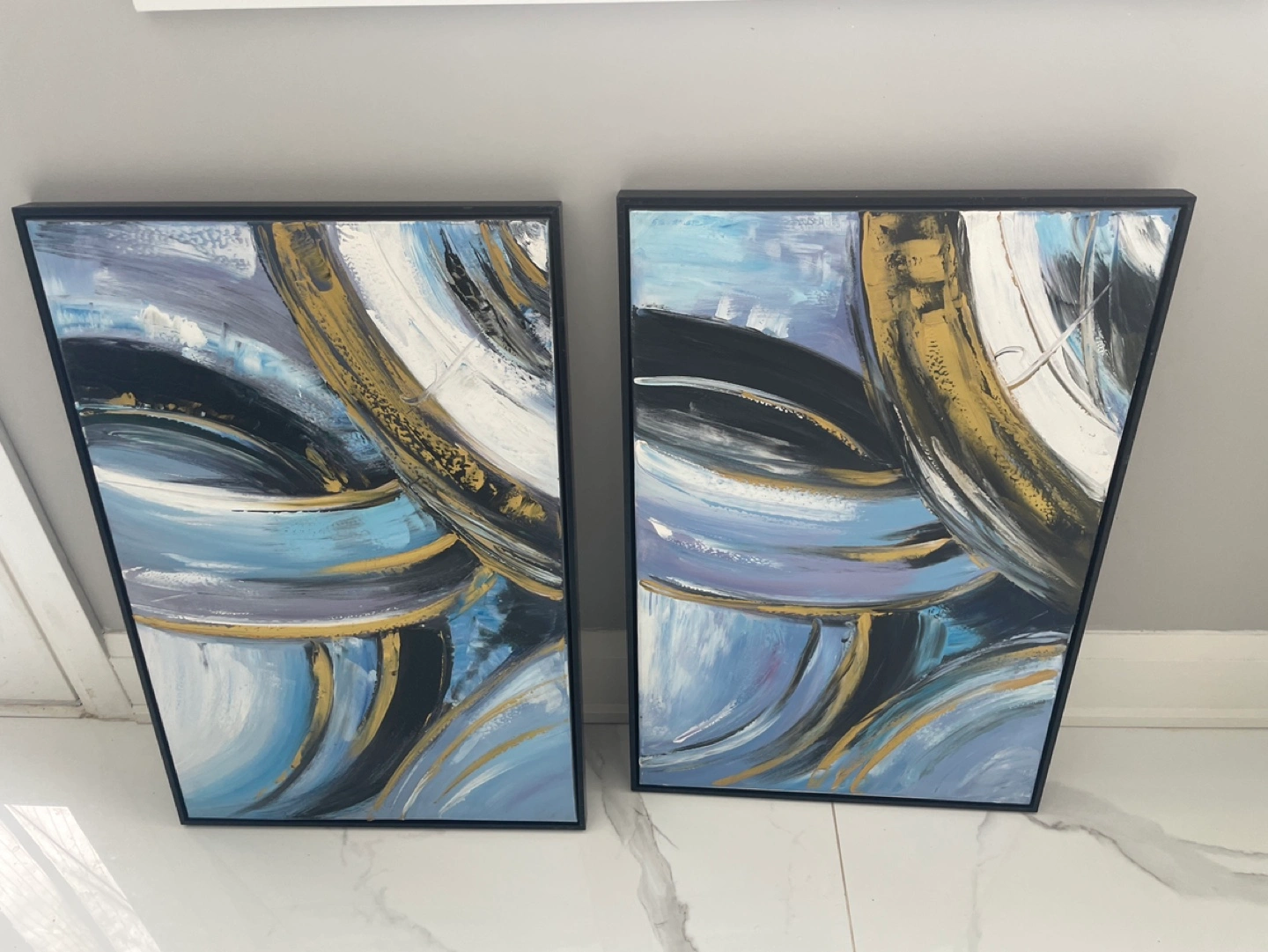 Stunning pair of large abstract canvas paintings. Blues, golds, and blacks. Modern design. Ready to hang. Perfect for a contemporary space. One: $80 Two: $160