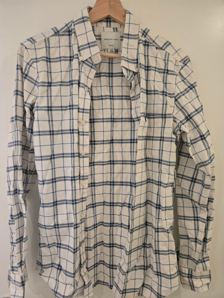 Men's long-sleeve button-down shirt. Slim fit. White and blue plaid pattern. Excellent condition. Pick up at Metrotown Cash Only