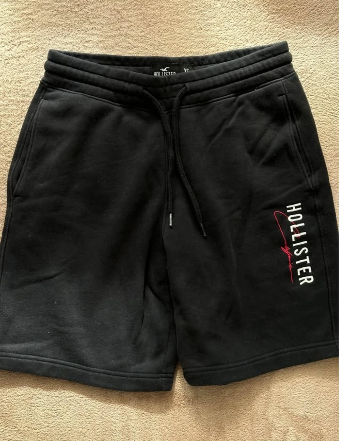 Men's black fleece shorts. Drawstring waist. Hollister logo on leg. Good condition.