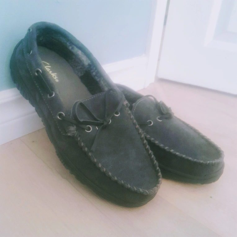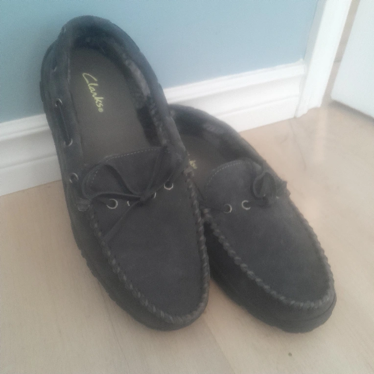 Dark grey suede moccasin slippers. Fuzzy lining. Durable rubber sole. New.